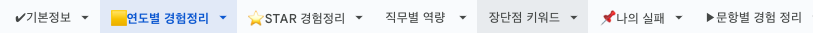 간단한 기본 정보와 이력부터 시작해서, 연도별/STARR 경험 정리, 그리고 직무별 역량에 맞춰 칸을 구분해두고 핏한 경험을 매칭해서 적었다.