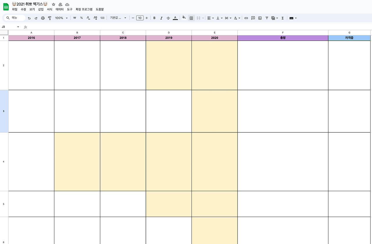 연도별로 했던 활동을 적어두고, 그중에서 나름 써봄직한 굵직한 활동을 하이라이트쳐뒀다. 그리고 했던 활동에서 인사이트를 찾기 위해 총평 칸도 넣어뒀다. (대략 요런 느낌으로 칸 구성)
