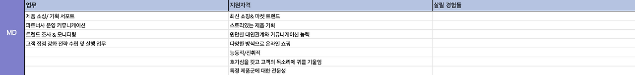 결국엔 이 직무에 가장 핏한 사람이 나라는걸 증명해야 한다. 그래서 지원자격을 열심히 파헤쳐봤다. 지원자격을 아예 시트로 파서, 업무- 지원자격 - 경험을 매칭했다.