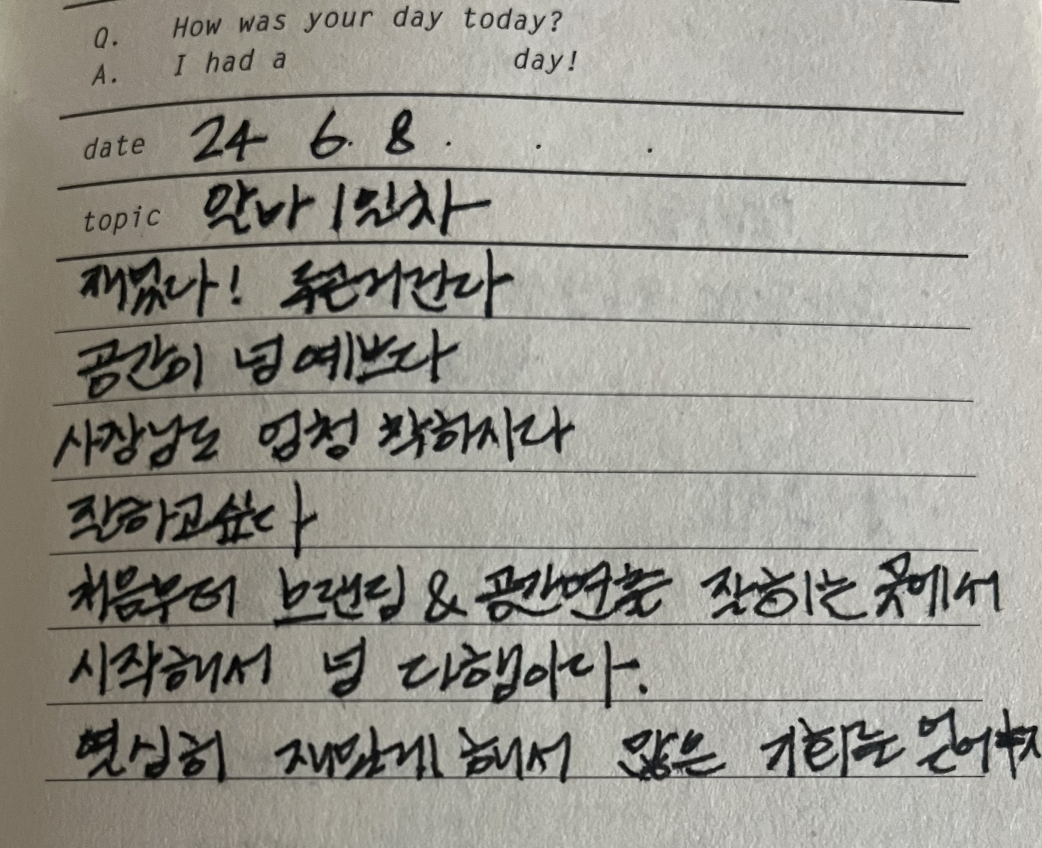 집에 가서 일기장을 피고 오늘의 감정과 배운 점을 기록했다. 나는 습득력이 빠르진 않은 편이니, 꾸준히 기록하고 생각하며 더 나아진 모습으로 일을 해야지.