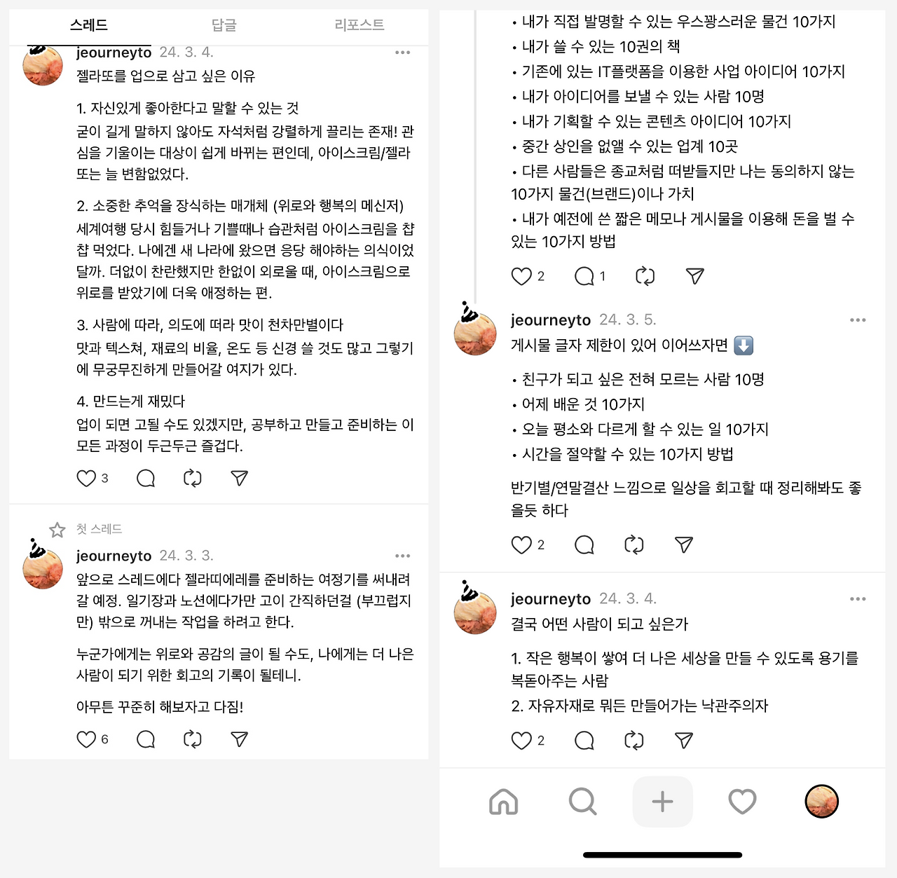 사실 스레드를 지난 3월부터 시작했었다. 그때는 일기장 목적으로 쓰려는게 컸다. 내가 지금하고 있는 생각을 그저 나만 알게 보관해두는 것보다, 오픈된 곳에 기록을 해두면 언젠가 이게 쌓여서 나라는 사람의 서사로 이어질 것이라는 생각이 들었다.