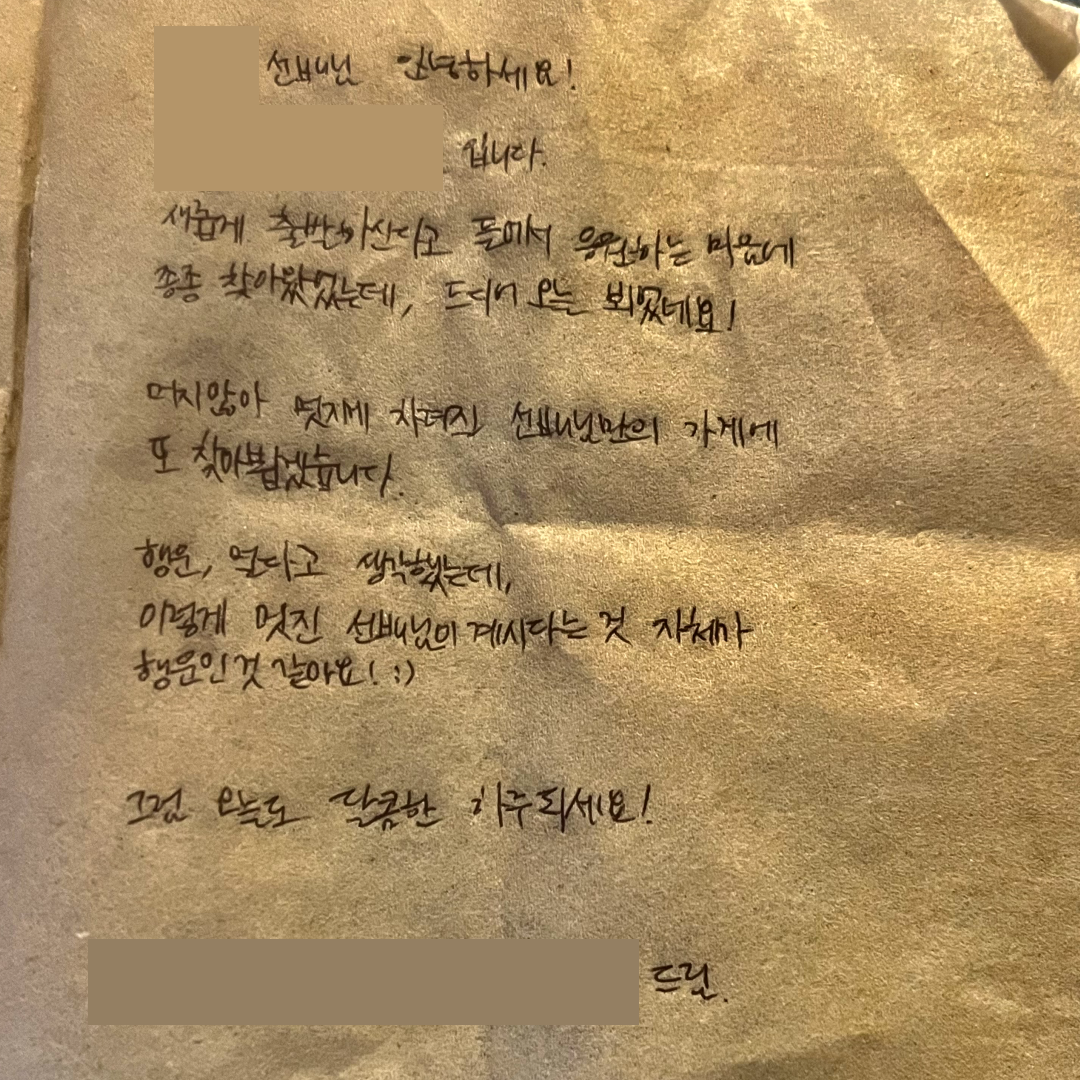 내가 살면서 실물 쪽지를 받았던게 몇년만인가.. 고등학교때 수업시간에 쪽지를 주고받은 이후로 성인이 되어 받는 건 처음이다.