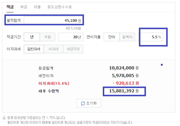 만약 매달 45,100원이라는 돈을 20년간 적금에 가입을 해서 20년 뒤에 15,971,100원이라는 돈을 만들려고 한다면 위의 그림처럼 매년 5.5%의 적금을 20년간 가입을 해야 합니다.