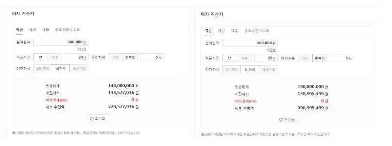 같은 방식으로 매달 50만원씩 연 5%의 수익을 내면서 20년간 투자를 해서 생기는 수익은 86,373,154원입니다. 그런데 5년을 더 투자해서 생기는 수익은 148,995,499원입니다.