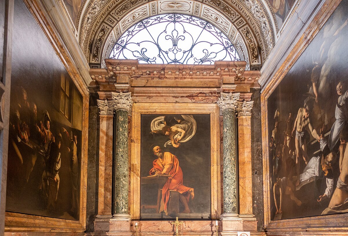 산 루이지 데이 프란체시. 로마의 프랑스인 성당. 콘타렐리 경당은 왼쪽 끝, 가장 어두운 곳. 경당의 유일한 자연광원인 뒤편 창문. 카라바조는 이 창문의 각도를 정확히 계산했다. 오후 특정 시간, 햇빛이 들면 그림 속 빛과 일치한다.