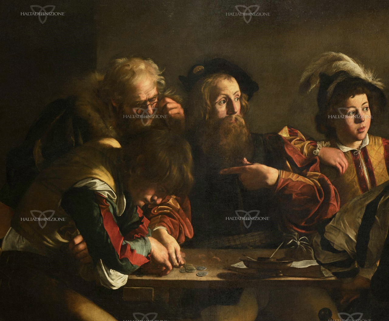다섯 명의 반응이 모두 다르다. 깃털 모자의 젊은이는 호기심에 찬 얼굴. 안경 쓴 노인은 동전을 움켜쥔다. 어린 소년은 그리스도 쪽으로 기운다. 모두 당대 의상을 입었다. 벨벳 조끼, 깃털 장식, 칼. 1세기 팔레스타인이 아니라 1600년 로마의 선술집 풍경이다.
