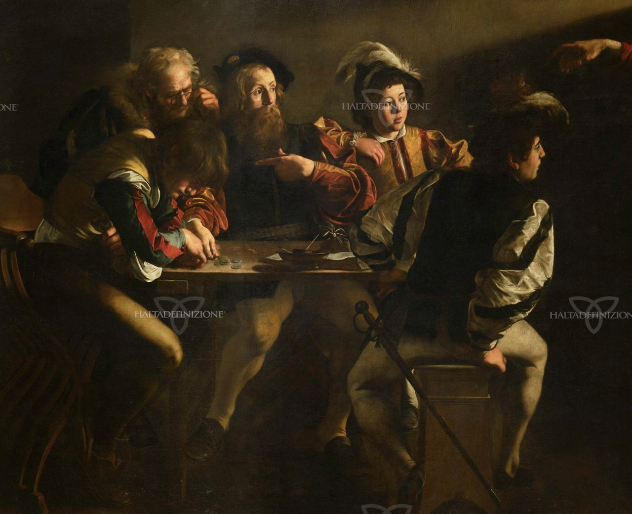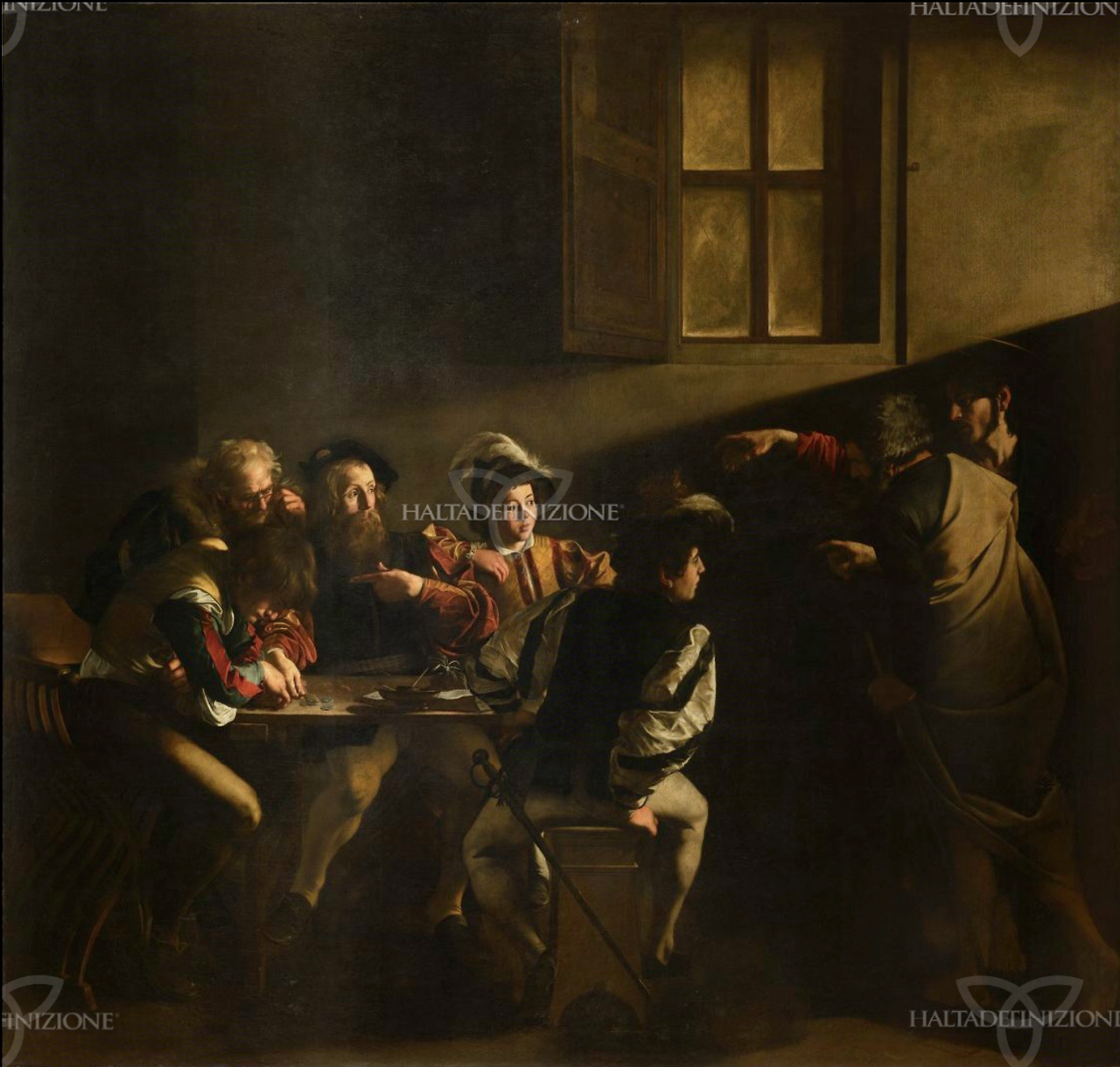 빛이 들어온다. 창문 너머로 사선으로 떨어지는 빛. 322 x 340cm 캔버스 속 어두운 세관에 한 줄기 빛이 비집고 들어와 탁자 위 동전을 세던 다섯 남자를 비춘다. 오른쪽 끝에서 한 손이 들려있다. 그 손끝이 가리키는 곳, 수염 난 남자가 자신을 가리킨다. "나요?"