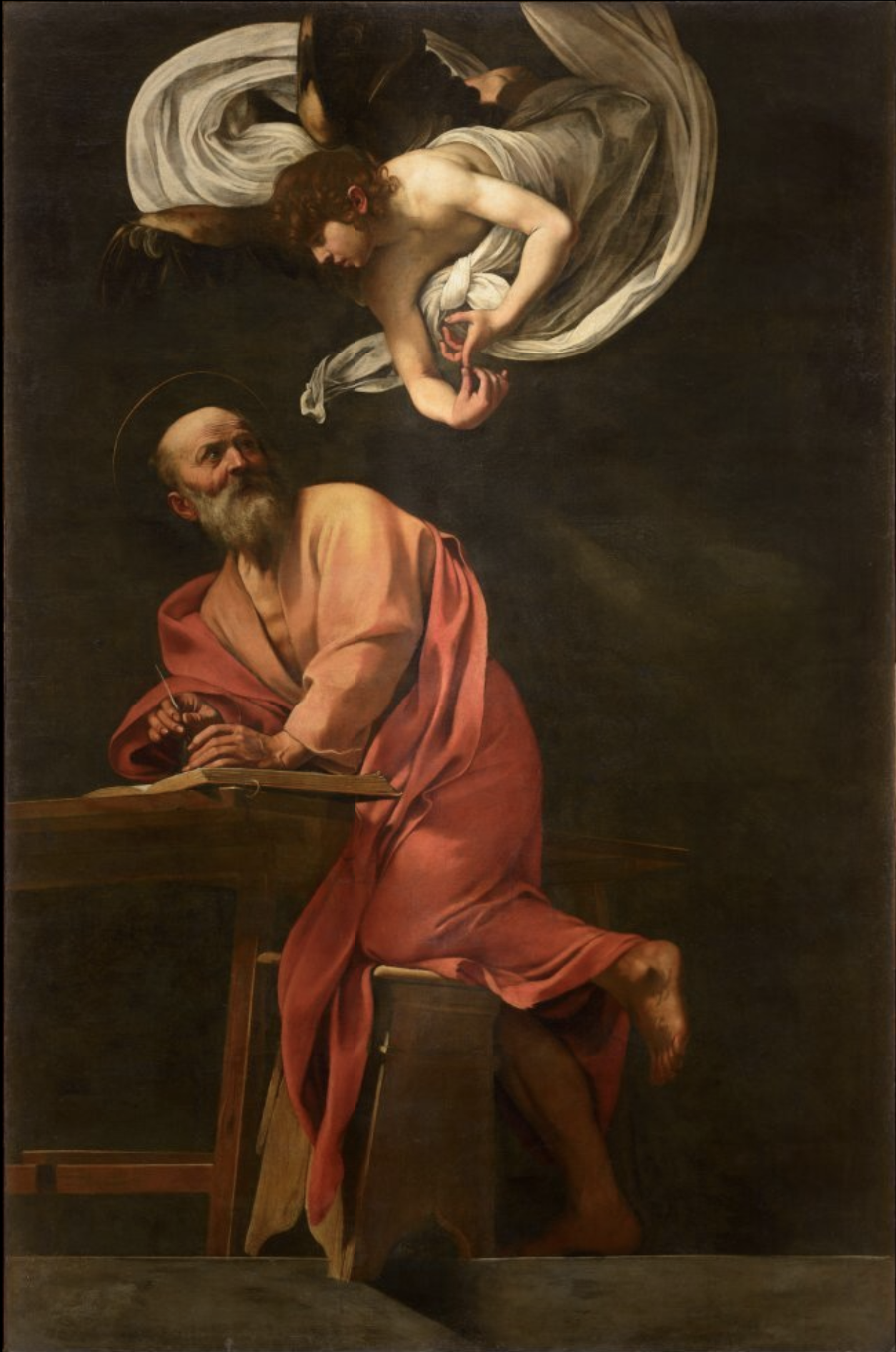 세속의 빛과 신성한 빛이 충돌한다. 왼쪽 위 창문에서 들어오는 일상의 빛. 오른쪽에서 들어오는, 광원이 보이지 않는 초월적 빛. 두 빛이 만나는 지점에 마태오가 있다.