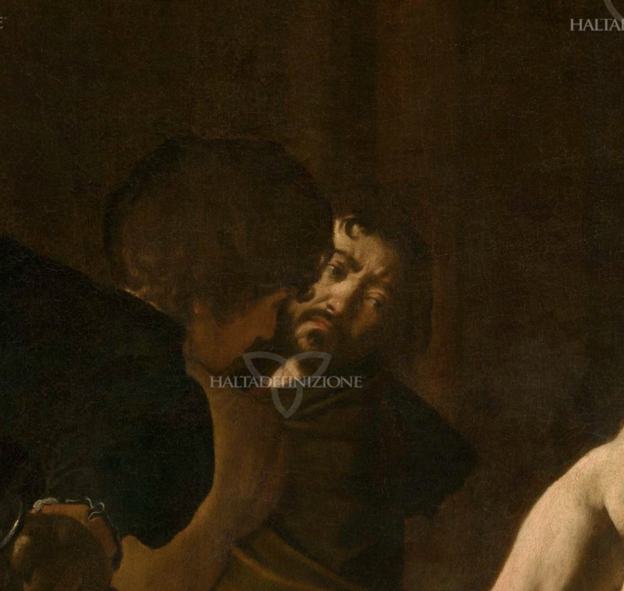구석에 뒤돌아보는 남자. 카라바조의 자화상이다. 목격자로서의 화가.