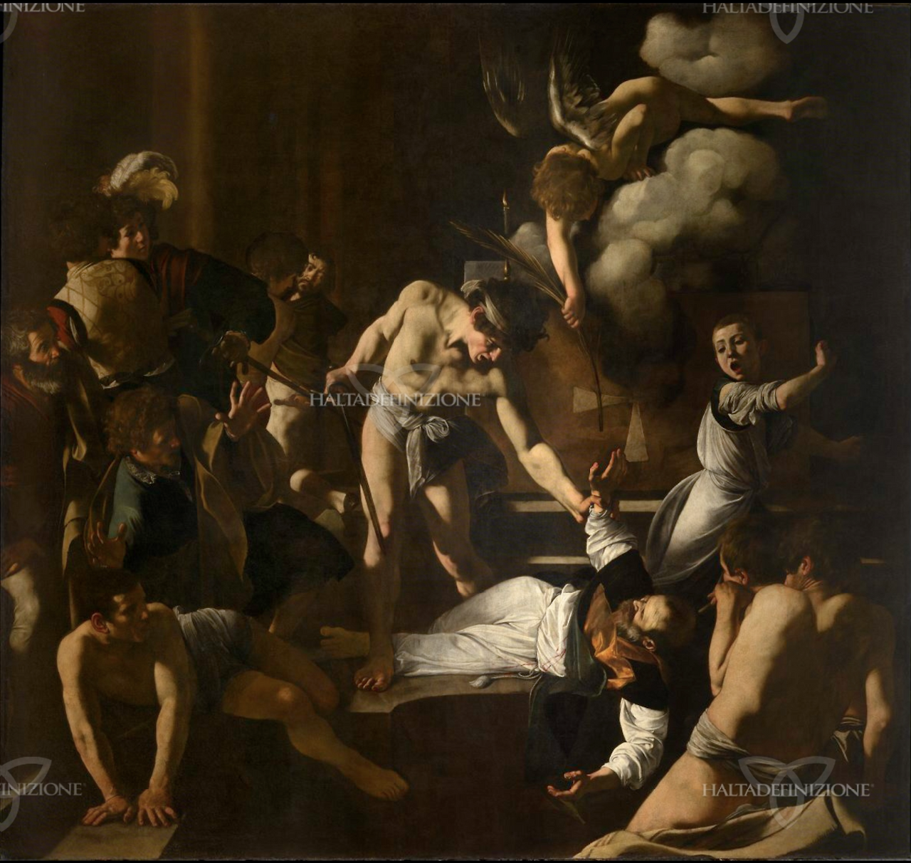 최종본. 건축물은 사라졌다. 세례당. 사제복 입은 마태오를 벌거벗은 청년이 칼로 찌른다. 천사가 순교의 종려나무를 건넨다. 중앙의 소용돌이. 도망치는 사람들, 놀라는 사람들, 공포에 질린 얼굴들.