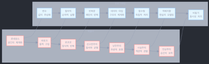 다소 억지스러운 연결일 수도 있지만, [그림 15]와 같이 르네상스의 원근법에서 시작하여 바로크의 시선 유도, 로코코의 반복적 장식, 신고전주의의 체계화, 낭만주의의 주관적 경험, 사실주의의 현실 묘사, 그리고 인상주의의 순간 포착으로 이어지는 미술사의 흐름은, 프로그래밍에서 변수의 개념에서 출발하여 절차적 사고, 반복문의 도입, 데이터 타입의 정형화, 독립적 함수의 등장, 객체 지향 프로그래밍, 그리고 비동기 프로그래밍으로 발전한 과정과, 개념이 비슷한 면이 있다.