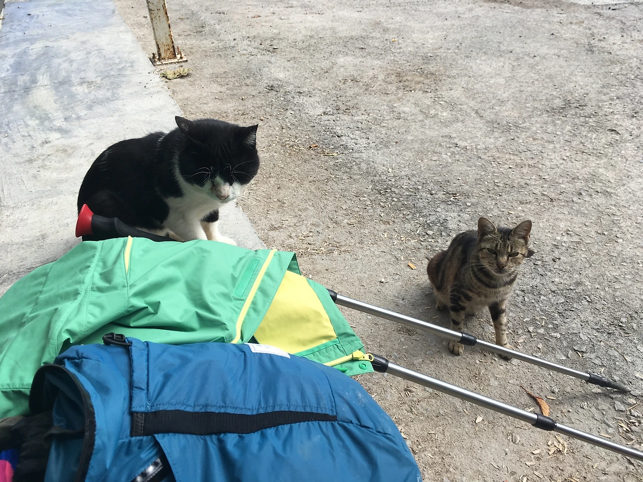 고양이에게 간식을 다시 건네자 못 이긴 척하고 받아먹는다. 그때 어디선가 다다다다 소리가 났다. 개 한 마리가 미친 듯이 달려왔다. 눈 깜짝할 사이, 와르르 달려오는 개를 피해 고양이들이 죽어라 도망간다. 순식간이다. 일망타진의 기쁨으로 나를 바라보던 녀석의 눈빛이 어찌 저리 순진한가. 저런 파워풀한 내침에는 사나운 눈빛 정도는 있어야 하는데, 전혀! 너무 귀엽다. 숨이 찼는지, 식수통에 가서 물을 벌컥벌컥 마신다. 내가 녀석에게 간식을 던져주자 냄새를 킁킁 맡더니, 그냥 가버렸다. 아니, 왜 과자를 안 먹어? 왜 간식에 관심이 없을까? 순례자들이 하도 많아서 이골이 난 것인가? 너무 순하고 예쁜 녀석들이었다.