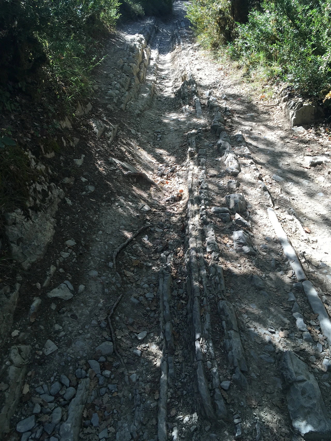 수비리까지 내리막이라더니, 어째 오르막이 자주 나온다. 산 특성산 오르락 내리락은 어쩔 수 없나 보다. 본격적인 내리막이다 싶은 길은 페스츄리처럼 얇은 바위들이 흙길에 세워져 꽂혀있다. 가로로 덮여있으면 지층이라고 생각하겠지만, 어찌 이리 흙길에 박혀 있지? 이 바위들로 걷는 게 쉽지 않았다. 여차하면 발을 헛디디고 접질릴까 봐 더 조심스러웠다. 이리저리 스텝을 밟으며 걸어가야 하니 신경이 쓰였다. 멍 때리고 걷다가는 고꾸라지기 좋은 길! 틱낫한 스님의 명상처럼, 한 발을 디딜 때마다 그 발바닥이 땅에 닿는 느낌을 온전히 깨어서 느껴야 했다. 무의식적인 걸음이 아니어야 했다. 정신줄 단단히 잡고 가야 했다.