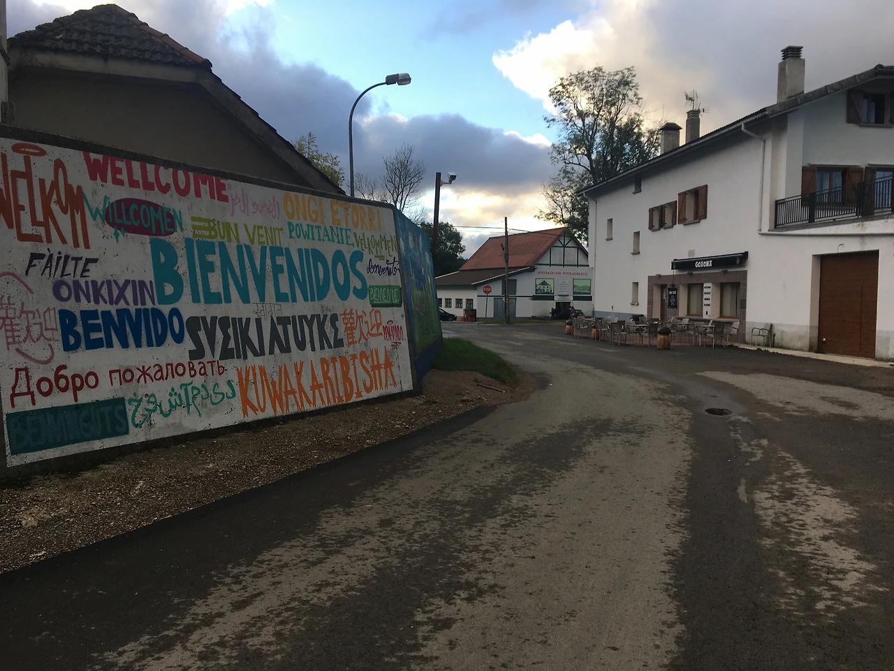 얼마간 오솔길을 걸었다. 아침 숲길은 사람을 기분 좋게 만든다. 한가로운 오솔길을 슬슬 걷다 보니, 어느새 동네 집들이 보인다. 그리고 만난 화려한 벽! 각 나라별 '반갑다 환영한다' 인사말이 적혀있었다.