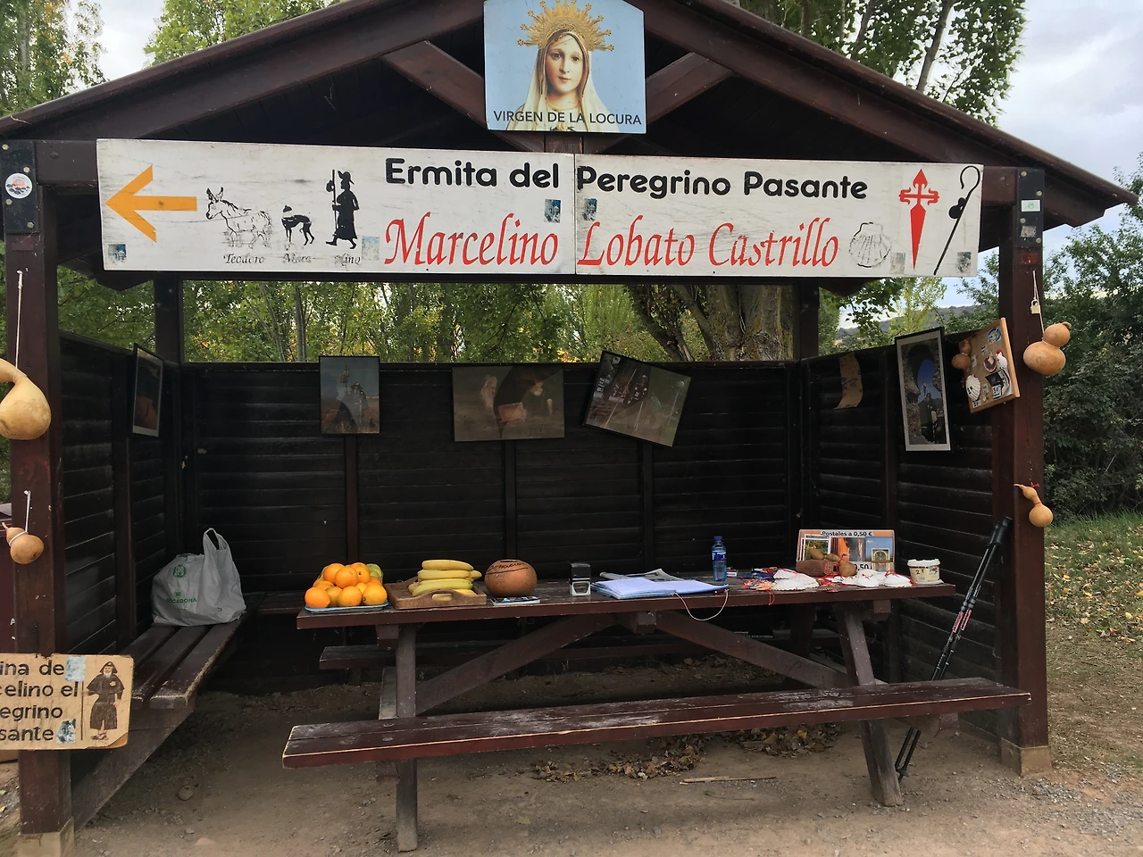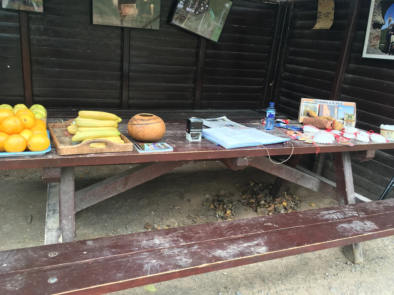 한참 걷다 보니, 임시 대피소 같은 곳이 보였다. 판매대 같은 곳에 사람들이 서서 뭔가를 먹고 있었다. 간이 슈퍼인가? 가까이 가보니, 도네이션으로 운영되는 순례자 쉼터였다. 이따금 순례길에서 볼 수 있다더니! 아무도 없고, 덜렁 기부금 통만 있다. 과일과 순례자 상징 조개껍질, 그밖에 물과 책, 더러 사람들이 돈 대신 놓고 간 물품들도 보였다. 나는 바나나를 집었다. 다른 건 별로 당기지 않았다. 공짜라도 막 가져갈 수 없다. 머리카락 무게도 느껴지는 길인데, 그냥 먹고 가야지, 욕심을 부릴 필요가 없었다. 대개 1유로 정도를 도네이션 박스에 넣는다. 사실 과일값이 싼 곳이니, 사 먹으면 더 쌀 수도 있다. 그저 이 한적한 길까지 가져다 놓은 수고에 대한 감사랄까? 어쨌든 기본 1유로 정도는 넣고 가는 듯했다. 물론 그 이상을 먹으며 대박 기회(?)로 여길 수도 있으려나? 하지만 굳이 그런 마음까지 들진 않을 것이다.