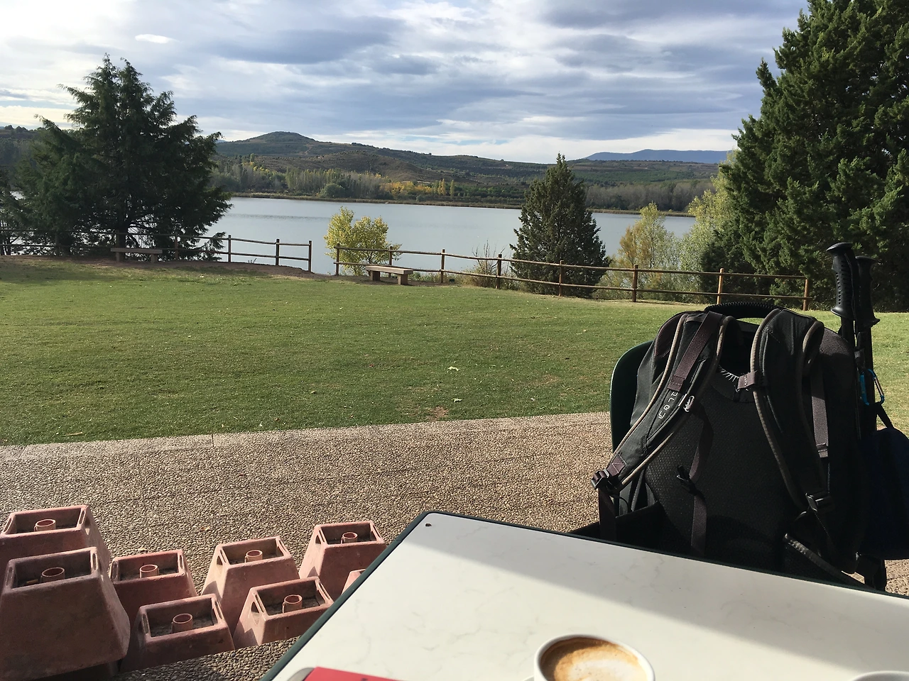 오늘 걸을 길은 약 12킬로! 로그로뇨에서 나바라떼까지! 이제 하루에 20킬로는 거뜬히 걸어야 할 테지만 여전히 하루 10킬로 안팎으로 걷고 있다. 많은 사람들이 머문다는 나바라떼를 그냥 지나칠 수 없기에! 엽서처럼 예쁜 공원, 관리사무소인가 싶은 건물에 호수 뷰가 있는 카페가 있다. 사람들은 빵과 커피로 느긋한 아침을 보내고 있었다. 우리도 카페 콘 레체와 크로와상을 시키고 얼마간 여유를 만끽했다. 이런 곳에 살면 참 좋겠다. 내내 살면 우울증 걸린다는 말도 있지만, 그래도 멋진 풍경은 우리의 로망 아니겠는가. 이제 강렬한 해의 위력을 느낄 시간이 다가온다. 볼이 얼얼할 정도로 달아오를 시간, 아침나절에 조금이라도 더 걸어둬야 하리라.