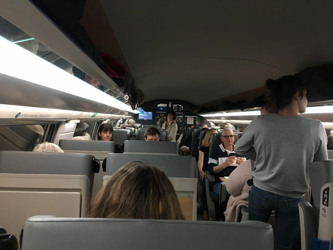 2층 계단으로 올라갔다. 두근두근두근! 테제베 2층 전망이 기대된다. 기차 안에 오르니, 많은 사람들이 있다. 역방향 자리도 빼곡하다. 정방향이 마감되고 난 뒤, 어쩔 수 없이 역방향으로 예약했을 것이다. 나처럼 역방향부터 미친 듯이 예약한 사람은 없겠지! 괜찮다. 완벽하지 못한 인간이 유럽 기차를 예약한 게 어디인가!