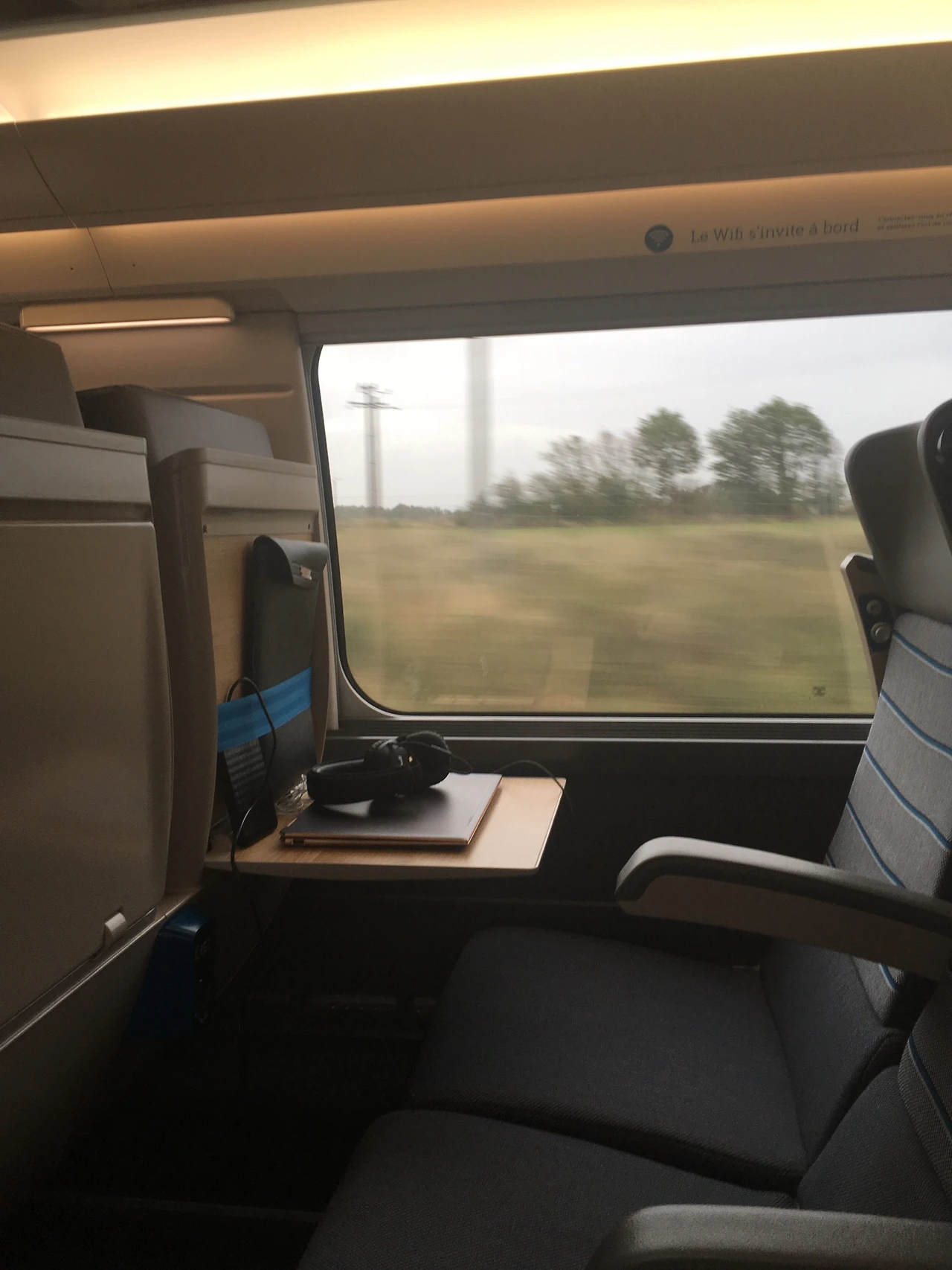 큰 짐은 객차 입구마다 놓인 짐칸에 놓으면 된다. 선점한 자리에 배낭을 비집어 넣어봤다. 공간이 있다. 안으로 들어오면 좌석 위에도 작은 짐을 넣을 공간이 있다. 가방 같은 짐들은 좌석과 좌석 사이 여유공간, 즉 발치 아래에 두어도 된다. 아무리 빨라도 비행기처럼 날아가지는 않으니까! 좌석 앞에 비행기처럼 개인 테이블을 펼칠 수 있게 되어있다. 유에스비 포트도 있어서 충전하면 된다. 와이파이는 등록만 하면 공짜로 쓸 수 있다는데, 포기했다. 그냥 4시간 동안 잠이나 잘까 싶었다.