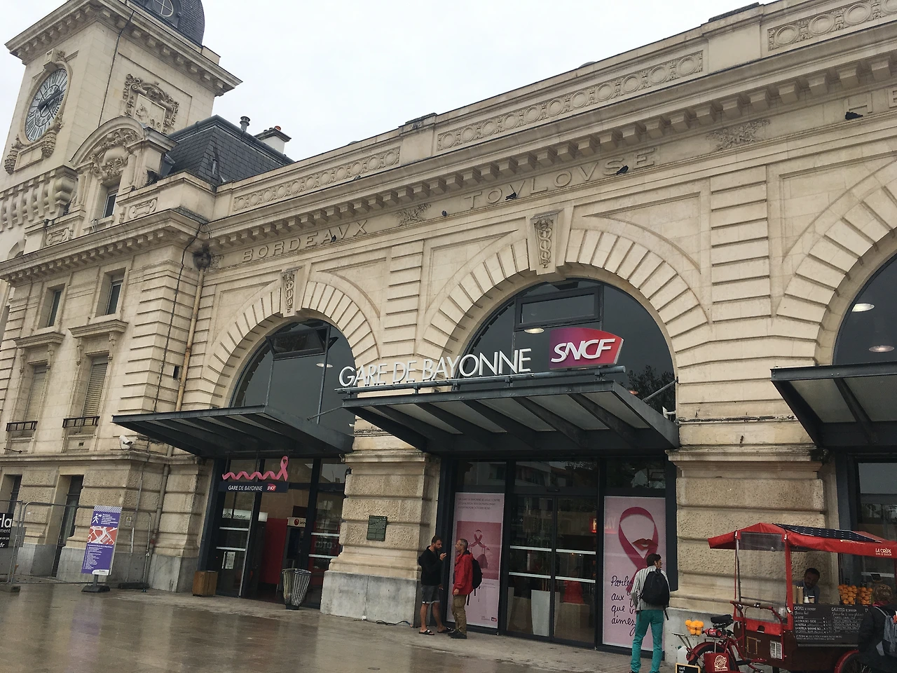 바욘 기차역을 배경으로 사진을 찍었다. 비 오는 바욘에서 배낭 멘 모습을 찍는 것도 의미가 있는 듯했다. 이제 거지꼴로 돌아다닐 텐데, 적어도 시작은 이렇게 멀쩡했다는 인증숏 정도? 길 건너에 카페가 있었다. 그런데 젊은 처자들이 주저한다.