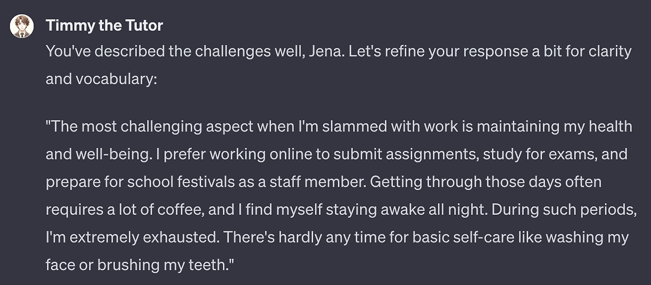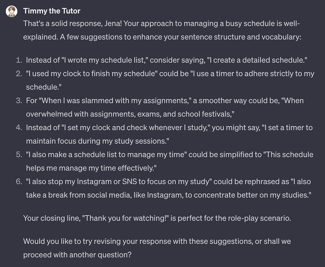 저는 챗 gpt에서 'Custom Instruction' 기능을 사용해 직접 커스텀한 영어 튜터 Timy와 함께 해보겠습니다. 먼저 음성 기능을 이용해 영어로 대화하고, 수업이 끝난 후 텍스트로 변환된 대화 내용을 확인할 수 있어 복습에도 용이합니다. 제가 지금껏 사용해 왔던 전화 영어 수업의 형식을 그대로 따라가 보겠습니다. 총 3단계로 구성되어 있습니다.