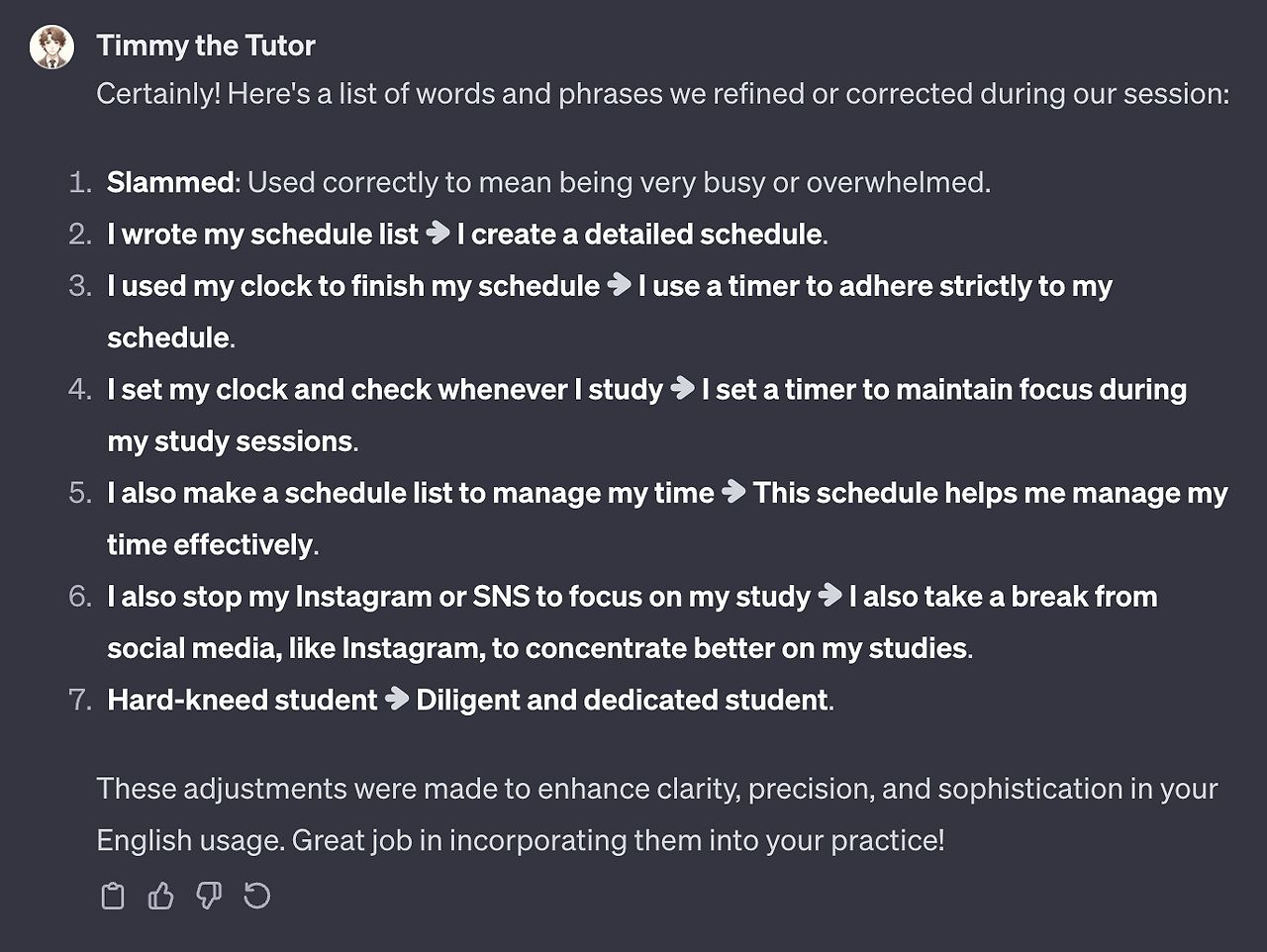 이번 수업에서 튜터가 고쳐준 표현, 단어들을 정리해서 보여달라고 요청하면 이렇게 어떤 문장을 어떤 식으로 바꿨는지 다시 리스트로 정리해 보여줍니다.