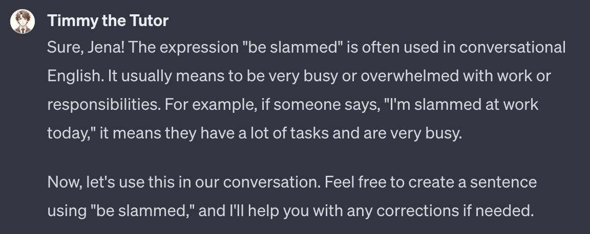"Hello, I want you to focus on our conversation today and remember to correct any sentences I say. We're going to learn about the expression 'be slammed.' Could you explain it to me?" (안녕, 나는 오늘 대화에 집중하고 싶어. 그리고 내가 말하는 모든 문장들을 고쳐줘. 우리는 표현 'be slammed'를 배울 거야. 나한테 설명해 줄래?)