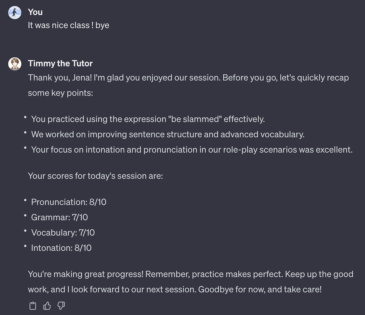 앞서 제가 커스텀한 튜터라고 말한 거 기억나시나요? Timmy는 제가 bye라고 말하면, 수업 동안의 제 답변 내용을 토대로 발음, 문법, 어휘, 인토네이션에 각각 점수를 매겨줍니다. 이번엔 대체적으로 꽤 높은 점수를 받았네요.