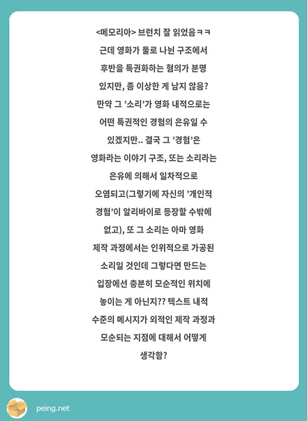 * 내가 운영하는 익명창인 페잉에 <메모리아>에 대한 질문 하나가 들어왔다. 답변을 하려고 차근차근 생각해보니 생각의 가지가 마구 뻗어나가서, 그 결과 약간 길어진 답변을 리뷰에 이어 추가로 게재한다. 음슴체와 평어체는 감안하고 읽어주시길 바란다.