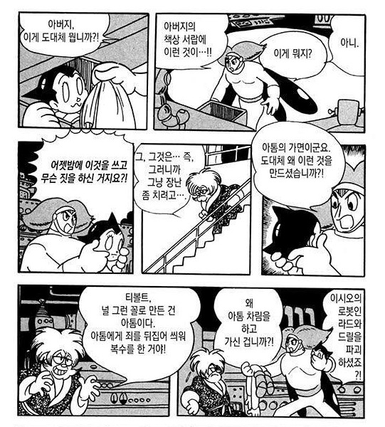 다시 아톰으로 돌아가 말하자면, 아톰에 내재된 반(半)인간성이라는 모순은 오히려 캬라에 대한 억압과 은폐의 실패를 어떤 방식으로든 끈질기게 증언하고 있지 않은가? 아톰이 인간적인 마음을 갖고 있지만 영원히 소년의 모습으로, 곧 과잉된 캬라로 살아간다는 사실을 떠올려 보라. 게다가 이토의 논리를 따라간다면 「지상 최대의 로봇」편에서 아톰 행세를 하기 위해 맨몸에 팬티만 걸친 채 플루토를 상대하러 가는 우란이나, 「로비오와 로비에트」편에서 아톰의 가면을 쓰고 로봇들을 해치는 야니 나츠타 박사는 아톰의 캬라의 자율화를 수행한다고 할 수 있지 않을까? (한데 후자에서 야니 박사가 아톰의 가면을 쓰는 장면이 작품 안에서 '직접' 제시되지는 않는다는 사실은 꽤나 의미심장하다) 캬라의 억압이라는 관점은 아톰에게서 (그리고 데즈카에게서) 미끄러지는 것이다.