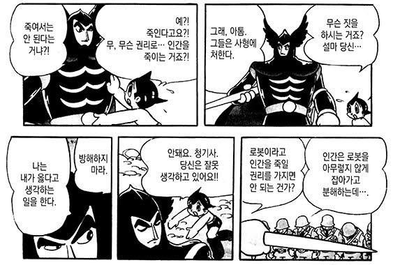 (...) 이러한 형상들 가운데서도 만화의 성질을 가장 통렬하게 직시하고 체현한 형상을 찾는다면 역시 「우주소년 아톰(鉄腕アトム)」의 아톰(을 비롯해 데즈카 오사무가 만든 캐릭터들)이 걸맞을 테다. 원전을 ‘지나치게 완벽하게’ 대체한 존재이자 자신의 몸을 얼마든지 갈아 끼우고 마력(馬力)마저 조절할 수 있는 아톰, 그렇기에 인간과 로봇 중 어느 쪽에도 귀속되지 못하는 곤란에 처해 있는 아톰. 성장하지 못하고 영원히 소년으로 살아가야만 하는 아톰…….