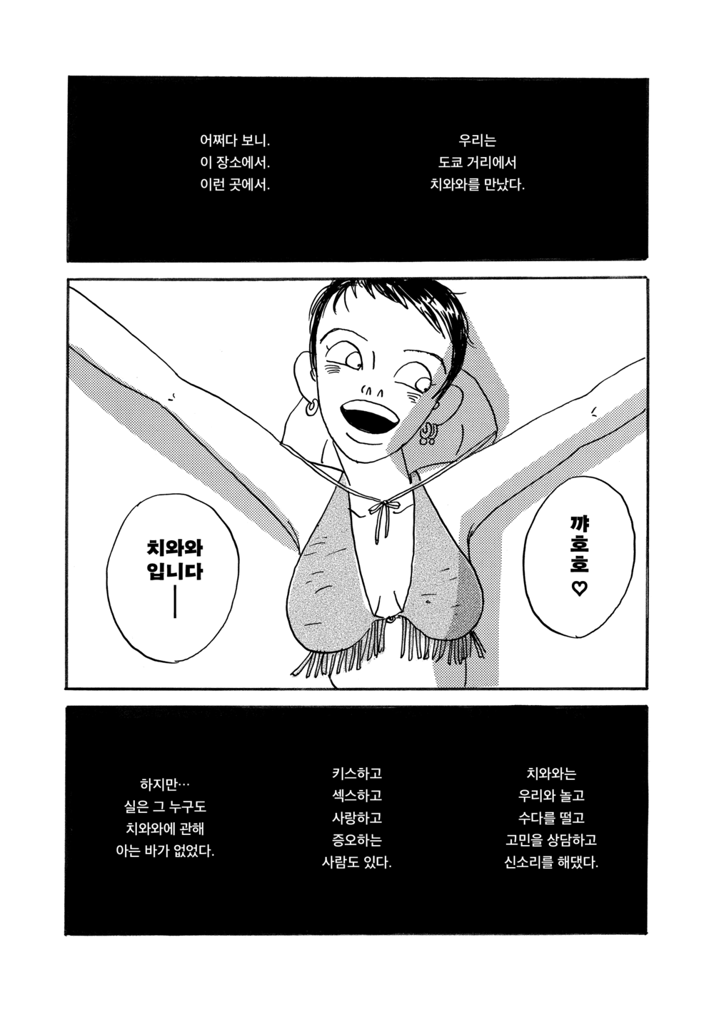 도쿄의 지정학적인 ‘악’에 휘둘려 ‘부정적인 것’들에 시달린 비극으로 치와와의 삶을 환원하려는 게 (도덕에 따른) 일반적인 추모라면, 치와와에게 결부된 ‘부정적인 것’들과 ‘악’의 관계를 재설정하려는 건 ‘난잡한’ 추모일 테다. 그런 추모 속에서 치와와의 삶은 지극히 복합적인 양상을 띄게 된다. 여러 인터뷰에서 묘사되는 치와와의 삶에는 즐거움과 슬픔이, 순진함과 비열함이, 도덕에 대한 갈망과 ‘부정적인 것’에 대한 끌림이 공존한다. 프리드리히 셸링이 말한 “예지적 본질”의 명징한 사례와 같이 모순적인 삶. 지그재그의 선으로 한 여자의 초상을 그리는 「치와와」는 (발터 벤야민을 맘대로 베껴) 말하자면 현대적 ‘수난극’의 하나로서, 주인공이 자기 삶의 희생자가 되는 것과 자기 삶의 지배자가 되는 것 사이에서 항구적으로 진동하는 미지의 영토로 우리를 인도하는 것이다.
