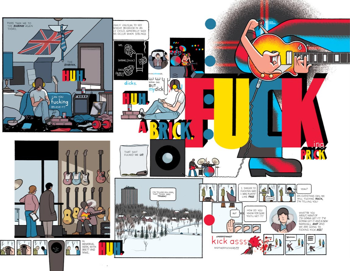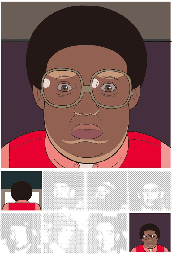 우디의 파트에선 칸의 의미론적 기능을 (다른 칸과의 도상적 유사성을 통해) 유보시키거나 ([그림 4]처럼) 흐트러트리고, 조던의 파트에선 (캐릭터가 일생에서 갖는 다양한 모습과 성격과 인식법을 차례대로 배치해) 만화적 캐릭터의 조건을 낱낱이 해체하고, 조앤의 파트에선 (혼란스럽게 뒤섞인 타임라인을 통해) 캐릭터에 대한 만화의 시간성을 문제시하고 있듯이, 『러스티 브라운』을 이루는 거의 모든 칸에는 오토 랑크가 말한 ‘현대적 더블’ 즉 홀로일 때에도 결코 홀로일 수 없다는 신경증적 불안이 내재한다. 괴팍하고 희유한 관계론자로서의 웨어. 그래, 나는 질 들뢰즈라면 ‘경련’이라 불렀을 상태를 여기서 웅성거림이라 부르고 있는 것이다. 내친김에 그의 말을 직접 빌리자면, “엄밀히 말해 신체는 빠져나가기 위해 노력하거나 기다린다. 내 신체로부터 벗어나려 하는 것은 나의 자아가 아니라, 신체 스스로가 자신으로부터 벗어나려 한다 […….] 한마디로 일종의 경련이다. 신체는 신경 그물과 같고, 그의 노력이나 기다림은 경련과도 같다. (『감각의 논리』)” 신체, 곧 이미지.
