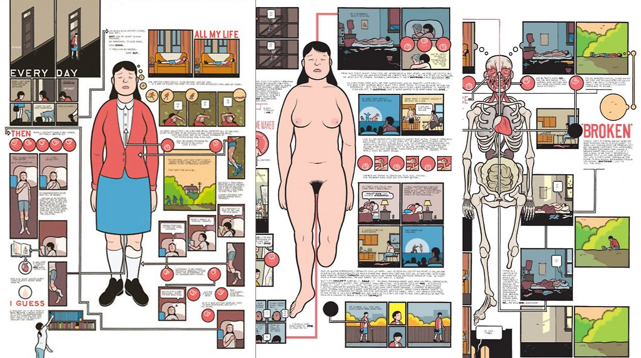 허면 우리가 『러스티 브라운』의 인물들을 그 ‘다양한’ 모습과 웅성거림의 배치에도 불구하고 각각의 캐릭터로 인식할 수 있는 이유는 대체 무엇일까? 달리 말해, 만화를 볼 때 우리는 대상이나 사건을 어떻게 바로 '그것'으로 느끼게 되는가? 이는 크리스 웨어가 우리에게 던지는 미스터리이기도 하지만, 『지미 코리건』에서 복합적으로 진행되는 ‘반복’이나 『빌딩 이야기』에서 세 페이지에 걸쳐 다이어그램으로 분석/해부되는(dissected) 주인공[그림 6]에서 유추할 수 있듯 사실 웨어 자신이 죽도록 골몰하고 있는 미스터리이기도 하다. 『러스티 브라운』이 만화의 사회적 기능을 한참 거스르는 작품이 되는 건 그 연장선에서다.