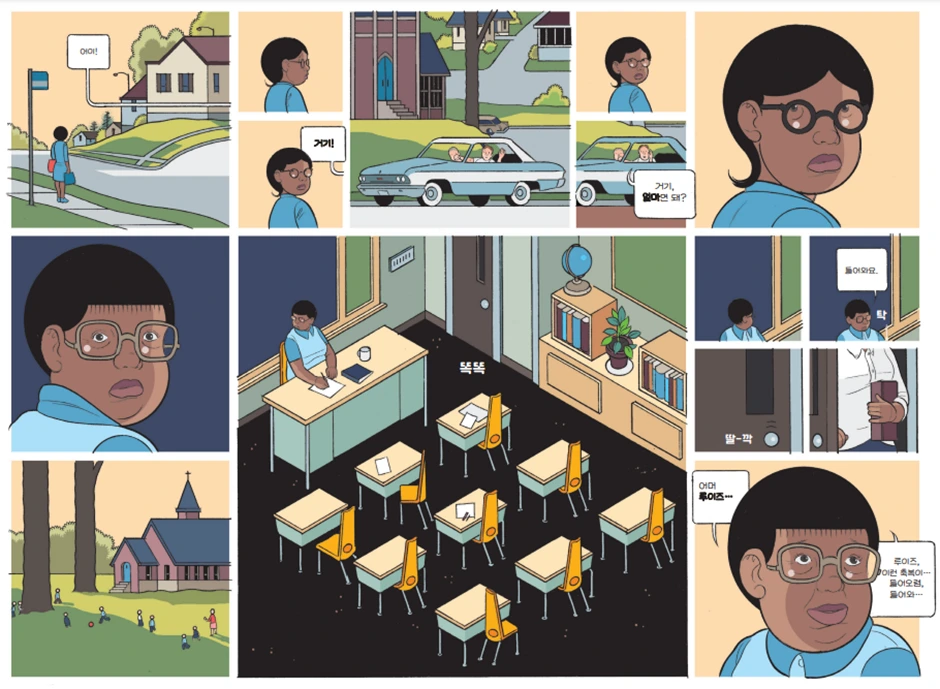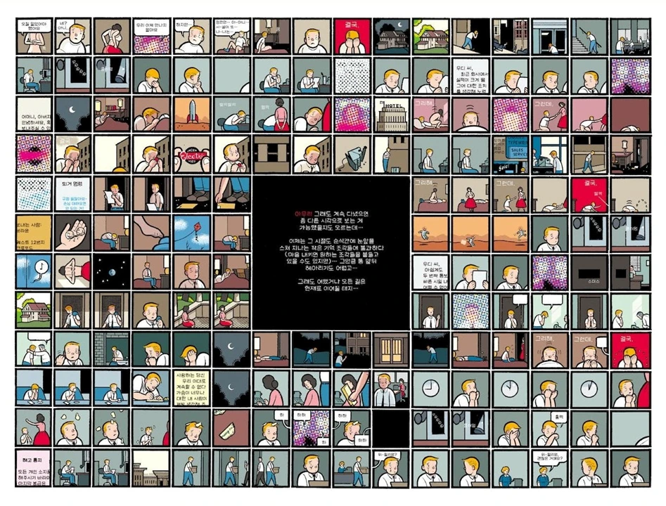 이를 테면 이런 식이다. 현실과 상상, 혹은 과거와 현재와 미래를 명시적인 계기 없이 오가거나, 유사한 구도의 칸 몇 개를 다닥다닥 붙여 놓거나, 페이지에 비해 칸이나 글씨의 크기를 너무 작게 만들어 그 내용을 살펴보기 어렵게 만들거나, 하나의 칸 다음에 어떤 칸을 보아야 할지 헷갈릴 정도로 빽빽하고 장황하게 칸을 배열하거나[그림 2], 캐릭터의 말을 홈통에 잔뜩 밀어 넣거나... 달리 말해 말이, 연상(聯想)이, 타임라인이, 사물이, 곧 이미지들이 제멋대로 앞다투어 나오고 활동하며 두꺼운 책의 거의 모든 페이지에서 웅성거리는 것이다. 이는 철저한 묘사라기 보다 묘사의 유보에 더 가까우며, 바로 그렇게 독자들의 일상적인 독법을 곤란하게 만들고 나아가 위협한다.