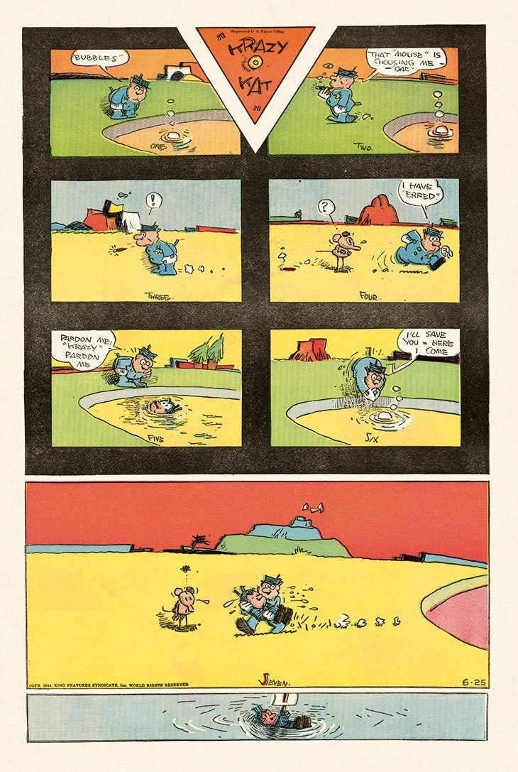 돌이켜보면 조지 해리먼의 『크레이지 캣(Krazy Kat)』, 프랭크 킹의 『가솔린 앨리(Gasoline Alley)』, 클리프 스터렛의 『폴리와 친구들(Polly and Her Pals)』과 같은 선조격의 (‘초현실주의적’인) 미국 만화들에서 따로 또 같이 흘러나온 것은 바로 만화의 이런 역할에 대한 희망찬 가설이었다. 캐릭터를 소외시킬 정도로 끊임없이 유동화되고 파편화되는 허구적 세계[그림 5]를 일찍이 만들어낸 이 위대한 만화가들은, 어쩌면 만화가 세계를 긍정할 새로운 인식 능력을 생산하고 훈련시키는 ‘테크놀로지’일 수 있으리란 가설을 타진하고 증명하고 급진화하는 데에 일찍이 전념했던 게 아닐까? (대니얼 래번의 책에도 쓰여 있지만, 웨어가 이들을 유독 사숙한다는 사실은 퍽 유명하다) 증명할 수 없을 뿐 더러 그들이 의식적으로 향한 길이 아닐 가능성도 높다만, 이 작품들을 보고 있노라면 그런 상상을 굳이 억누를 필요는 없을 것 같다.