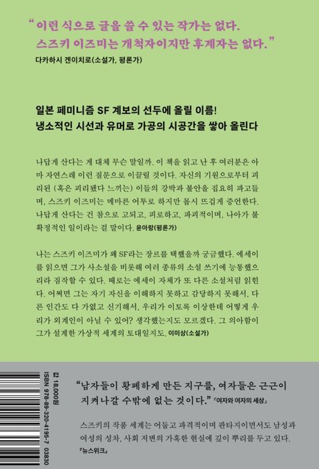 소설가 박솔뫼의 추천 덕분에, 스즈키 이즈미의 근사하고 기기묘묘한 소설 및 에세이들을 묶은 선집 『여자와 여자의 세상』을 미리 읽고서 (소설가 이미상과 더불어) 추천사를 썼다. 소설도 퍽 흥미롭지만 그보다 에세이가 훨씬 더 재밌다.