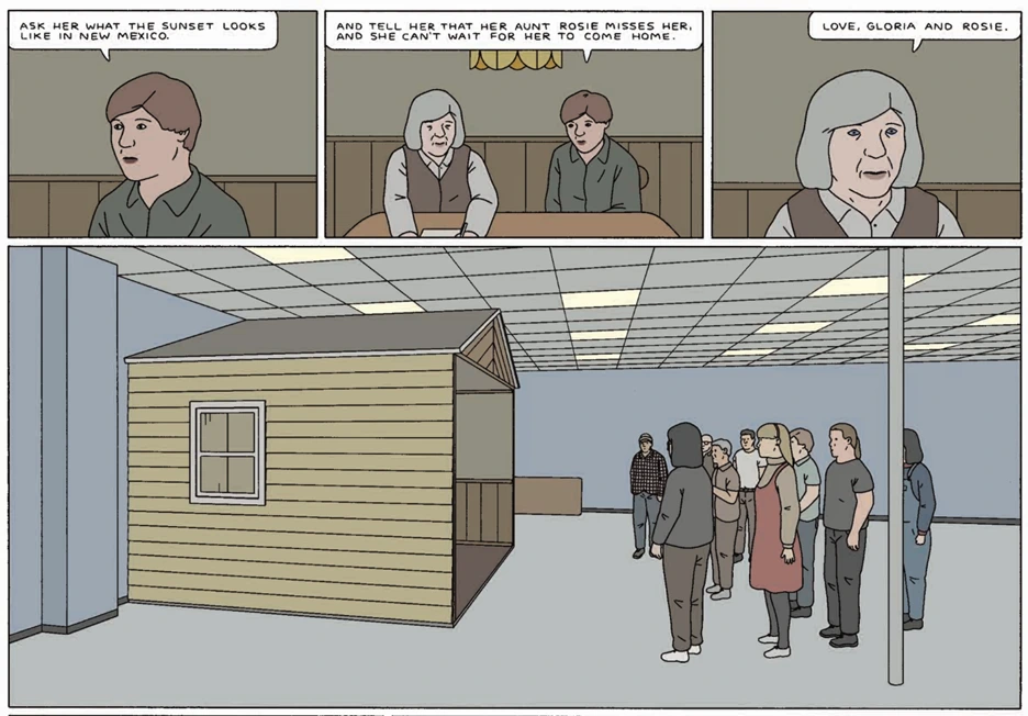 허구와 실재가 구분할 수 없어진다는 말은 『연기 수업』에선 좀 더 구체적으로 발음되어야 한다. 드르나소의 비상상성은 허구와 실재 양자를 똑같이 엄정한 이미지로써 배치하는 방식으로도 나타나기 때문이다. 부부가 소개팅을 연기하는 첫 장면에선 연기의 전과 후가 일관된 연출로 그려지는 정도지만, 수업의 2회차에선 연기 중인 신(Scene)과 현실을 구분하던 각각의 공간적 배경이 어긋나고, 4회차에선 캐릭터들이 연기하는 신의 시공간적 배경이 엄청나게 확장되고 복잡해지면서 진행 중인 사건이 허구일 경우 캐릭터들이 ‘실제로는’ 무엇을 하고 있을지가 불확실해지며, 162페이지에선 신을 연기하는 와중에 강당에 있던 적도 없고 있을 수도 없는 나무집 세트가 난데없이 들어섰다 사라지기도 한다([그림 3]). 물론 연기에 극도로 몰입한 참여자들의 상상으로 이루어진 주관적 풍경이라 ‘상식적으로’ 말하기는 쉽다. 하나 이런 기묘한 연출로 인한 우리의 당혹감이 그것만으로 해소될 리 있을까.