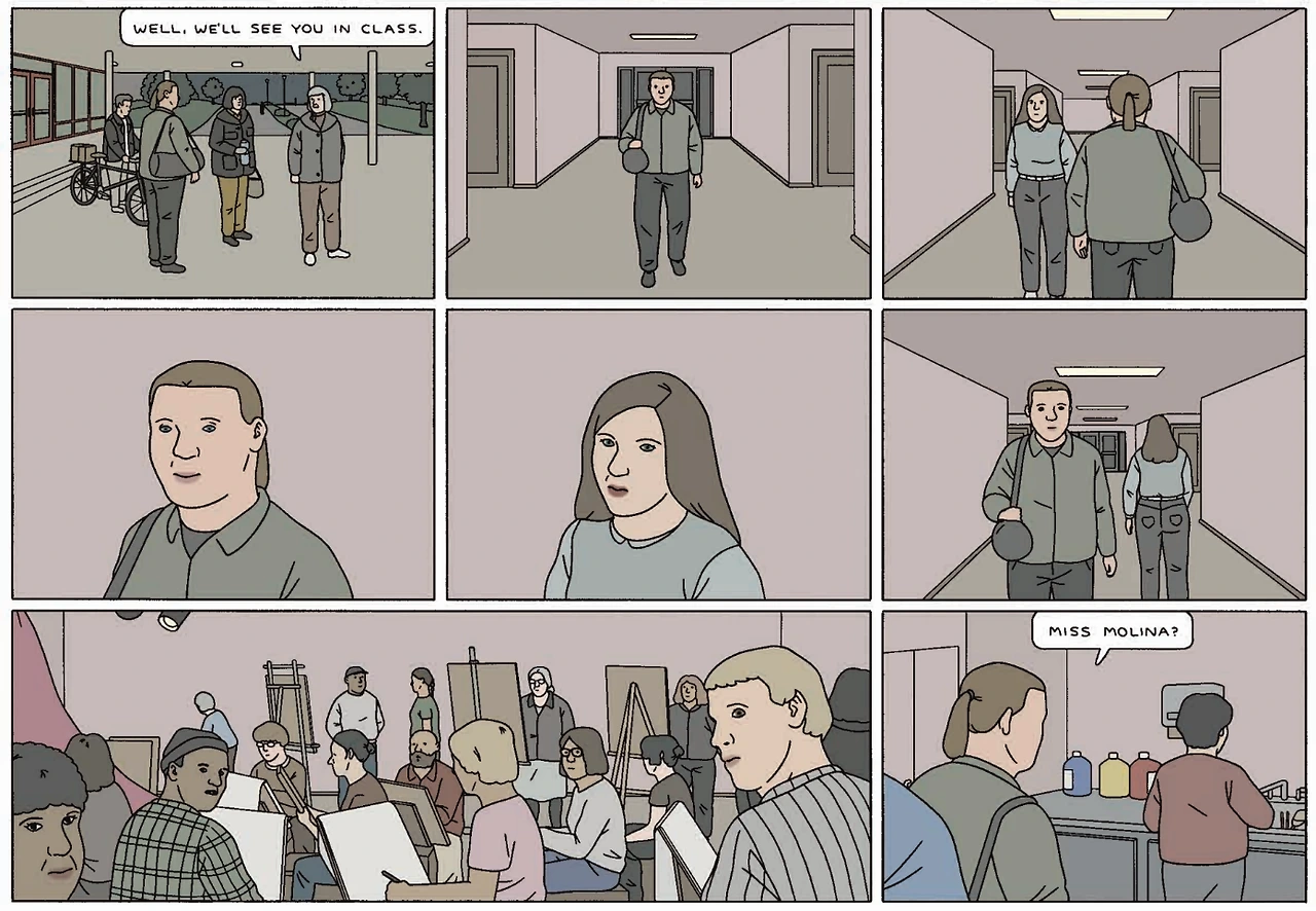 『베벌리』, 『사브리나』, 그리고 이 『연기 수업』에 이르는 드르나소의 장편 만화들에서 누구에게나 즉각적으로 각인되는 건, 역시 건조하며 모호하기 짝이 없는 특유의 화풍과 연출일 것이다. 3번째 수업이 끝난 이후인 130페이지에서 토머스가 인물화 수업용 누드 모델 일을 하기 위해 스튜디오로 걸어갈 때, 드르나소는 뜬금없이 토머스의 반대편에서 걸어오는 여성의 단독 프레임을 삽입한다([그림 2]). 그리고 토마스의 칸과 그 여성의 칸을 정면 바스트 숏(인물의 머리부터 가슴까지를 포착하는 숏)으로 번갈아 제시한다. 이후 이 여성 캐릭터는 단 한 번도 재등장하지 않는다. 그럼 이 장면의 정체는 대체 무엇일까. 두 사람이 우연히 눈을 마주친 걸까? 토머스가 이 여성에게 반한 걸까? 아니면 이젠 지나가는 아무개의 시선마저 그에겐 육중하게 느껴지는 걸까? 안 그래도 이리 불확실한 것을, 캐릭터가 무슨 표정을 짓고 있는지 확신할 수 없을 만큼 단순하고 정적인 얼굴 데포르메는 더더욱 불확실하게 만들고 있다.