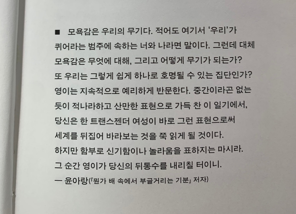 "모욕감은 우리의 무기다. 적어도 여기서 ‘우리’가 퀴어라는 범주에 속하는 너와 나라면 말이다. 그런데 대체 모욕감은 무엇에 대해, 그리고 어떻게 무기가 되는가? 또 우리는 그렇게 쉽게 하나로 호명될 수 있는 집단인가? 영이는 지속적으로 예리하게 반문한다. 중간이라곤 없는 듯이 적나라하고 산만한 표현으로 가득 찬 이 일기에서, 당신은 한 트랜스젠더 여성이 바로 그런 표현으로써 세계를 뒤집어 바라보는 것을 쭉 읽게 될 것이다. 하지만 함부로 신기함이나 놀라움을 표하지는 마시라. 그 순간 영이가 당신의 뒤통수를 내리칠 터이니."