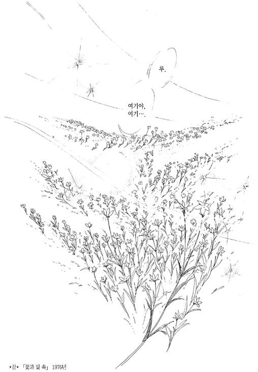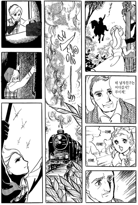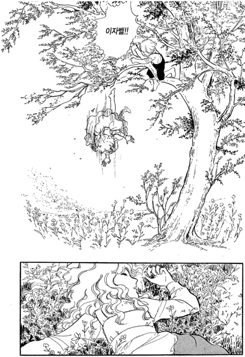 <꽃과 빛 속>을 한 번 다시 읽어볼까요? 화기애애하게 눈을 마주치고 대화하던 루이와 이자벨은 곧 이자벨의 추락으로 인해 다시는 만날 수 없는 처지가 됩니다. (여담이지만, 하기오에게 있어 '뒤집어지면서 추락하는 몸' 역시 아주 중요한 모티프입니다) 이후 '다른' 이자벨을 들판에서 만나는 장면의 구도를 유심히 보면, 기이하게도 루이와 '다른' 이자벨은 각각 단독적인 컷으로만 제시돼요. 이 두 사람이 같은 컷 안에 들어가는 순간은 오직 루이가 폭력을 가하는 때 뿐이죠. 이후 루이가 다른 사람과 눈을 마주치는 순간이 또 언제인가요? 머시에게 이자벨이기를 강요하는 때이거나, 머시가 이자벨이 아니라며 버리는 때죠. 어느 쪽이든 연인에게 할 수 있는 최악의 행동들입니다. (여기서 히치콕의 <현기증>을 떠올리는 게 비단 저만은 아닐 겁니다) 그리고 루이는 마침내 이자벨을 만납니다만, 이 초현실적인 순간은 한 페이지에만 묘사가 되고 그 다음 마지막 페이지에선 아예 두 사람이 (혹은 이 모든 걸 두려움의 표정으로 지켜보는 듯한 머시까지) 우리 시야에서 사라지죠.
