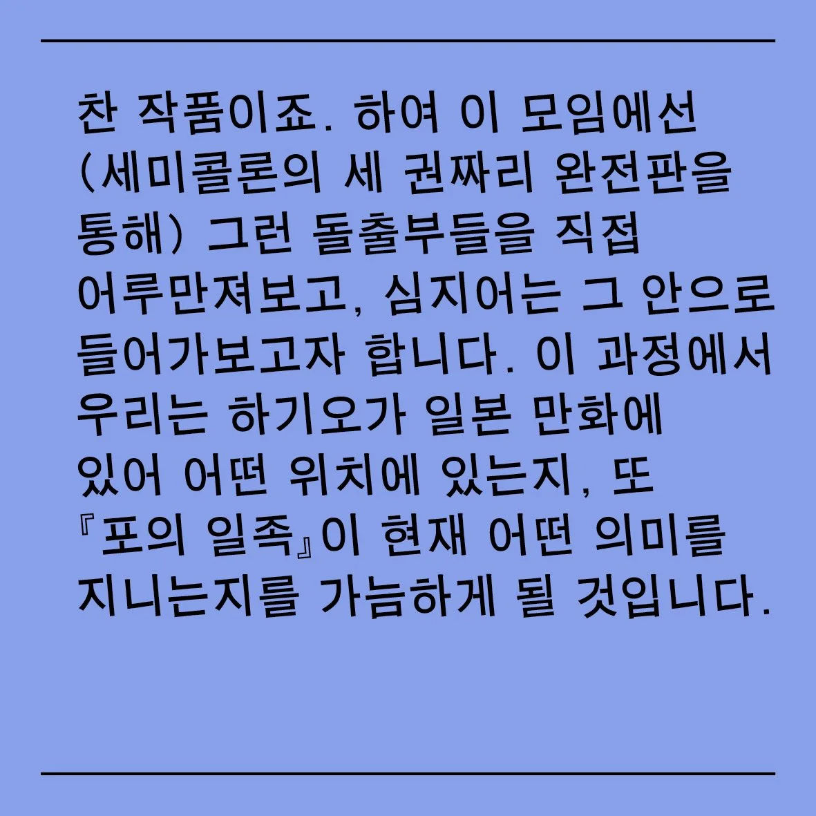 그 속에서 우리는 하기오가 일본만화에 있어 어떤 위치에 있는지, 또 『포의 일족』이 현재적으로 어떤 의미를 갖는 작품인지를 좀 더 알 수 있게될 것입니다. 또한 6월 25일의 인트로덕션에선 시각예술기획자이자 만화연구자인 한윤아 선생님께서 하기오 모토에 대한 특강(인스타그램 링크)을 해주십니다. 현재 하기오 연구에 대한 번역을 준비하고 계신 만큼 해주실 말씀이 많을 것 같아요. 기대하셔도 좋습니다. 이전 pt.1을 함께 하지 않은 분들도 큰 무리 없이 모임에 참여하실 수 있을 터이니, 관심있는 분들은 걱정 말고 신청해주세요. 감사합니다!