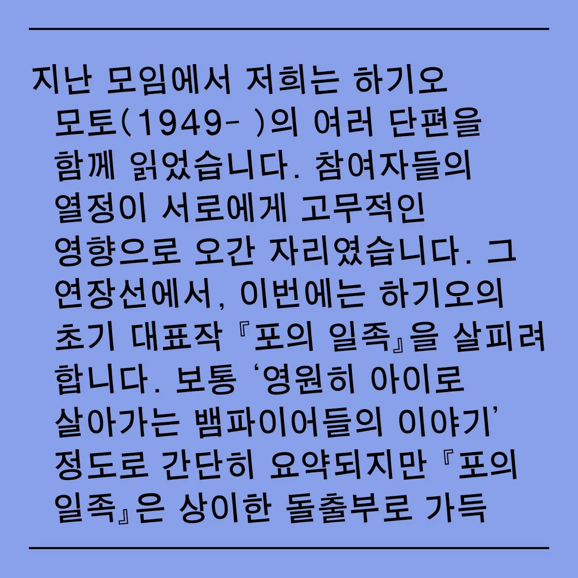 지난 번 모임에서 저희는 하기오 모토(1949~)의 여러 단편을 함께 읽었습니다. 참여자들의 열정 덕분에흥미진진한 자리가 계속 이어졌고, 그만큼 서로에게 고무적인 영향을 주고받을 수 있던 것 같습니다. 그 연장선에서, 이번에는 하기오의 초기 대표작 『포의 일족』을 여러분과 함께 읽어보려 합니다. 보통 ‘영원히 아이로살아가는 뱀파이어들의 이야기’ 정도로 간단히 소개되곤 하지만, 『포의 일족』은 그렇게 설명될 수 없는 상이한돌출부로 가득 찬 작품이죠. 하여 이 모임에선 (세미콜론의 3권짜리 완전판을 통해) 그런 돌출부들을 직접살펴보고, 어루만져보고, 심지어는 그 안으로 들어가볼 수 있도록 하고자 합니다.
