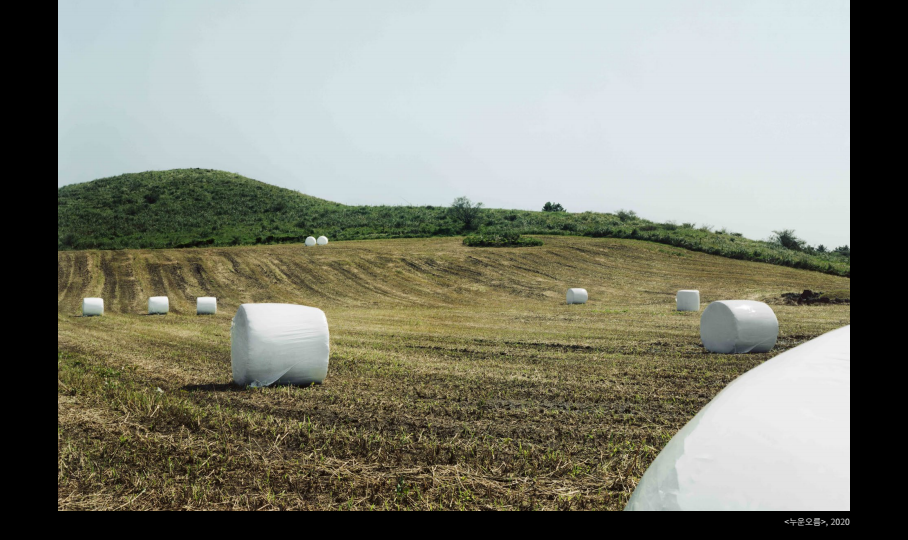 새삼스럽고 우둔한 질문 하나, 왜 양지훈은 두 개의 작업을 해야만 했을까? 좀 더 구체적으로 말해, 왜 하나의 폭력적인 경험에 대해 두 개의 접근법이 필요했(다고 생각했)던 걸까? 〈서옥에서〉를 이루는 개개의 사진들을 보고 있노라면 4.3의 흔적을 ‘더 잘’ 보여주려는 태도 같은 걸 여기서 찾을 수는 없다는 생각이 든다. 가령 곤포 사일리지들이 고즈넉하게 늘어서 있는 누운오름의 사진[그림 1]과, 양서옥의 어머니가 늦둥이 아들 “창옥의 우는 소리가 굴 밖으로 새나가지 않도록 빈 젖을 계속 물”렸던 곳이 바로 여기 누운오름이란 사실은 곧장 중첩되는가? 70년 전 양서옥의 피난길과 거기서 일어난 사건들을 가능한 한 세세하게 정리하고, 그에 따라 북마크를 찍어 놓은 구글 지도 화면을 캡쳐해놓기도 했음에도, 아니 어쩌면 당연하게도, 양서옥이 걷고 보았던 길과 양지훈이 걷고 보았던 길은 쉬이 겹쳐지지 않는다. 그 사이에 모습이 바뀌었을 뿐만 아니라, 그 길을 걷고 보는 데 있어 두 사람이 놓인 조건이 전혀 달랐기 때문이다. 종종 등장하는 불안정한 구도나 기이하게 프레임에서 잘려 나간 신체들[그림 2]은 마치 장소 자체에선 더 이상 발견할 수 없는 이러한 시차(時差/視差)를 어떻게든 육화해보려는 시도로 느껴지기도 한다. (당연하지만 참사의 재현에 있어 이런 지표적(indexical) 불일치의 전략에도 계보는 있어서, 가령 사진에서라면 우리는 마사 로슬러의 『세 작품』(1981)이나 질 페레스의 『텔렉스 이란』(1983) 등을 가장 먼저 떠올릴 수 있다)