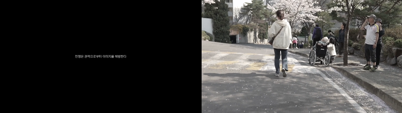 이를 더욱 전면화하는 것은 2채널 영상작업 〈테이큰〉으로, 여기서 양지훈은 (포스트 인터넷 아트에서 클리셰가 된 화면 캡쳐 영상을 바탕으로) 이미지와 폭력적 사건 사이의 관계에 대한 변증법적 반전의 아포리즘을 연이어 직설적으로 던진다. “사진을 위해 산불이 있다.”, “전쟁은 권력으로부터 이미지를 해방한다.”[그림 4], ”해방된 이미지를 위하여 풍경이 만들어졌다.”… 물론 우리에겐 멀리로는 “서로를 예속시키는 부단한 일련의 이미지들이 우리를 대신한다”고 말한 장 뤽 고다르가, 가까이로는 “이미지에 참여함은 곧 이 모든 것에 참여함을 뜻한다”고 말한 히토 슈타이얼이 있으므로 이런 아포리즘 자체는 아주 생경하거나 충격적인 것은 아니다. 하나 〈테이큰〉에서 진정 우리의 주의를 끄는 것은, 실제로 자신이 사는 지역 근처에서 일었던 산불을 포착하려 양지훈이 들고 나갔던 카메라에 찍힌 시퀀스 숏-POV가 이 아포리즘과 함께 나란히 스크리닝 된다는 사실이다. 양지훈은 지나치게 솔직해 보일 만큼 스스로의 연루를 자꾸 드러내고 있다. (그래서인지, 종종 들리는 그의 거친 호흡은 계속되는 언덕배기를 올라서가 아니라 포토제닉한 순간을 마주한다는 흥분 때문이 아닐까 하는 헛된 상상도 문득 들었다) 그러면서 아포리즘과 POV는 서로에 대한 코멘트가 되고, “사진을 위해 산불이 있다”는 말은 더 없는 무게감을 갖는 것이다.