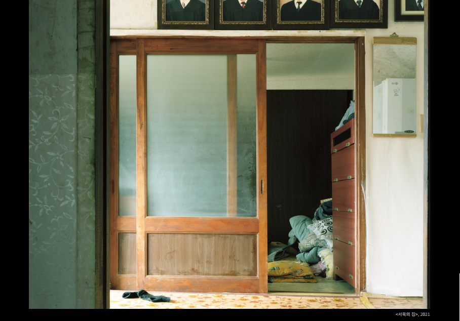 먼저 작가 자신의 부계 쪽 할아버지인 양서옥을 축 삼은 두 작업을 살펴보자. 16살이었던 양서옥은 제주 4.3 사건을 겪었다. 그런 그가 약 70년 후인 2019년에 자신의 경험을 늦게나마 기사화했을 때야 양지훈은 그 경험을 처음 알게 되었다. 이를 계기로 촬영 장비와 함께 무작정 할아버지가 계신 제주도로 내려간 양지훈은 (작가노트에 서술된 바에 따르자면) 한편으론 “기사에 언급된 파편적인 지명으로 할아버지가 올랐던 피난길을 그려보”며 “변화된 모습으로 남아있는 할아버지의 타의적 이동 경로를 따라가 보”고, 다른 한편으론 “무작정 할아버지를 찾아”가 4.3 때 얘기를 해달라며 “자신도 카메라 앵글 안에서 같이 술을 마시며 조금씩 대화”를 이어가면서 두 개의 작업을 만들어갔다. 전자는 사진 작업인 〈서옥에서〉이고, 후자는 영상 작업인 〈포수〉이다.