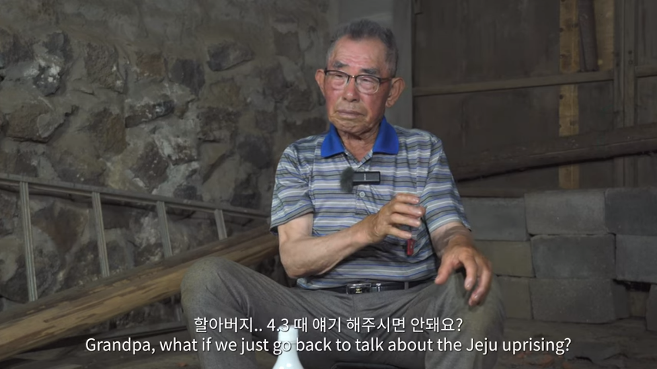마지막에 이르러서야 우리는 대답을 구한다. 사담이 길게 나오기 시작하자 편집점이 눈에 띄게 이어지더니 곧 양지훈이 직접 그에게 주문한다. “할아버지, 4.3 때 얘기해주시면 안 돼요?”[그림 3] 그리고 이어지는 거절. 앞서 말했듯 이런 거절은 맨 처음과 마지막에 수미상관처럼 배치되어 있다. 이쯤에서 피어오르는 외설적인 상상. 어쩌면 지금까지 자연스럽게 나온 줄 알았던 양서옥의 경험담은 모두 이런 주문의 반복 속에서 겨우겨우 나왔던 건 아닐까? 즉 그의 경험담은 전부 투명하게 기술된 게 아니라, 계속 양지훈에 의해 어느 정도 매개되었던 게 아닐까? 양서옥의 발화를 방해하던 노이즈들은 이 지점에서 달리 느껴지기 시작한다. 그와 우리 사이의 매개 속에서 발생한 시차를 폭로하려는 (묘하게 오메르 파스트적인) 제스쳐로 말이다.
