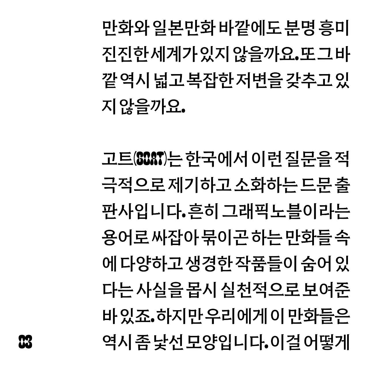 쪽프레스의 브랜드 고트(goat)는, 한국에서 이런 질문을 적극적으로 제기하고 또 소화하는 드문 출판사입니다. 흔히 "그래픽노블"이라는 용어로 간단히 싸잡아 묶이곤 하는 해외의 만화들 속에 다양하고 생경한 작품들이 숨어있다는 것을 몹시 실천적으로 우리에게 보여주었죠. 하지만 한국의 우리에게 이 만화들은 역시 아직은 좀 낯선 모양입니다. 이걸 어떻게 읽거나 이해해야 할지 모르겠다고 불평하는 독자들을 종종 마주치곤 하니 말이지요. 이것이 안타까워, 이번에 저는 고트에서 출간된 만화들을 함께 읽고 논하는 자리를 만들어보고자 합니다.