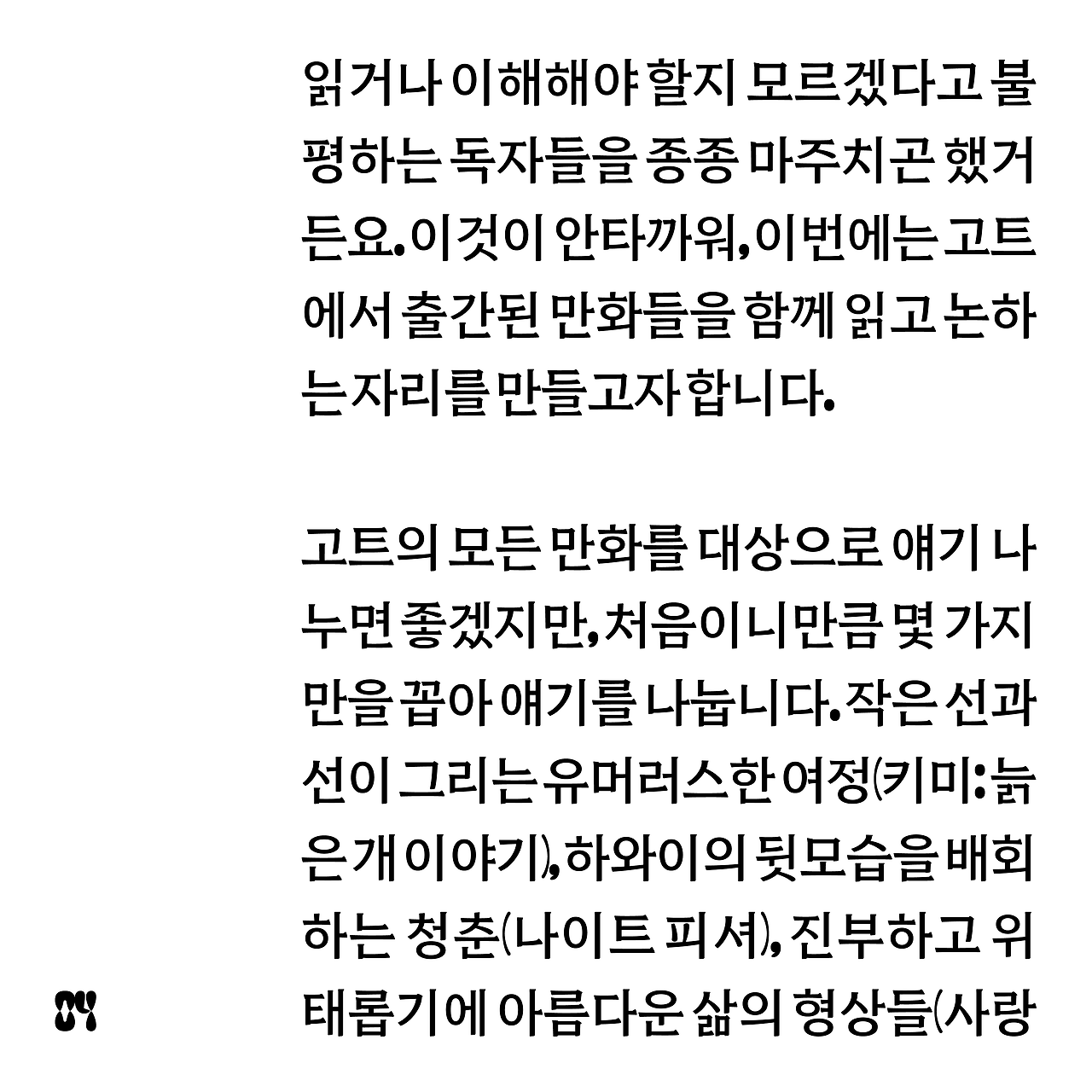 물론 고트의 모든 만화를 갖고서 모임을 진행하면 더욱 좋겠습니다만, 이번에는 그중 몇 가지만을 꼽아 함께 읽고 얘기를 나누려 합니다. 작은 선과 선이 그리는 유머러스한 여정(『키미 - 늙은 개 이야기』), 하와이의 뒷모습을 배회하는 청춘(『나이트 피셔』), 진부하고 위태롭기에 아름다운 삶의 형상들(『사랑에 서툰 사람들』), 비일상적인 일상(『바이러스 트로피컬』), 그리고 ‘함께 산다’는 말을 재정의하게끔 만드는 사람들(『킬링 앤 다잉』)을 따라가는 과정 속에서, 우리는 '어렵다'나 '낯설다'는 말을 넘어서서 만화를 한층 폭넓게 대할 기회를 얻게 될 것입니다.