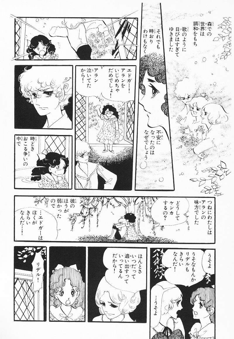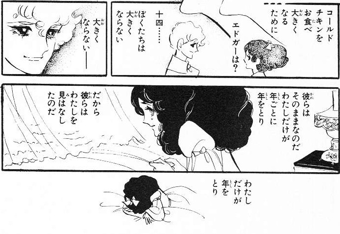 우리가 흔히 어떤 작품을 볼 때 찬사로 쓰곤 하는 말이 있죠. '시간 가는 줄 몰랐어!' 그런데 <포의 일족>은 정반대입니다. '시간이 흐르지 않는 것 같아!'가 적합한 작품이죠. <포의 일족>은 앞에서 말한 이유들 때문에 실제로 읽는 속도도 느려지고, 그래서 (디제시스 내적인 시간보다는) 작품 자체의 픽션적인 시간이 더디게 흘러간다는 느낌을 줍니다. 그런데 작품 안에서도 이런 대사들이 종종 나오지 않던가요? 시간의 흐름에 대한 대사들 말이에요. 「포의 일족」에서 열렬히 구애하는 앨런에게 "앨런! 우리랑 같이 멀리 갈 테야?... 시간을 넘어서... 멀리 갈 테야?"라고 에둘러 말하는 메리벨, 「글렌스미스의 일기」에서 "산다는 건 아주 고달픈 일이라서, 묵묵히 하루하루 살면 되는데도 가끔은 너무 힘들기 때문에... 약한 사람은, 특히나 약한 사람은, 이루어질 수 없는 꿈을 꾸는 거란다."라며 간접적으로 고백하는 엘리자베스, 「리델♥숲 속에서」에서 "나는 해마다 나이를 먹었지만 그들은 그대로였다. 그래서 날 버린 거야. 나만 나이를 먹어서."라고 뒤늦게 깨닫는 리델라...