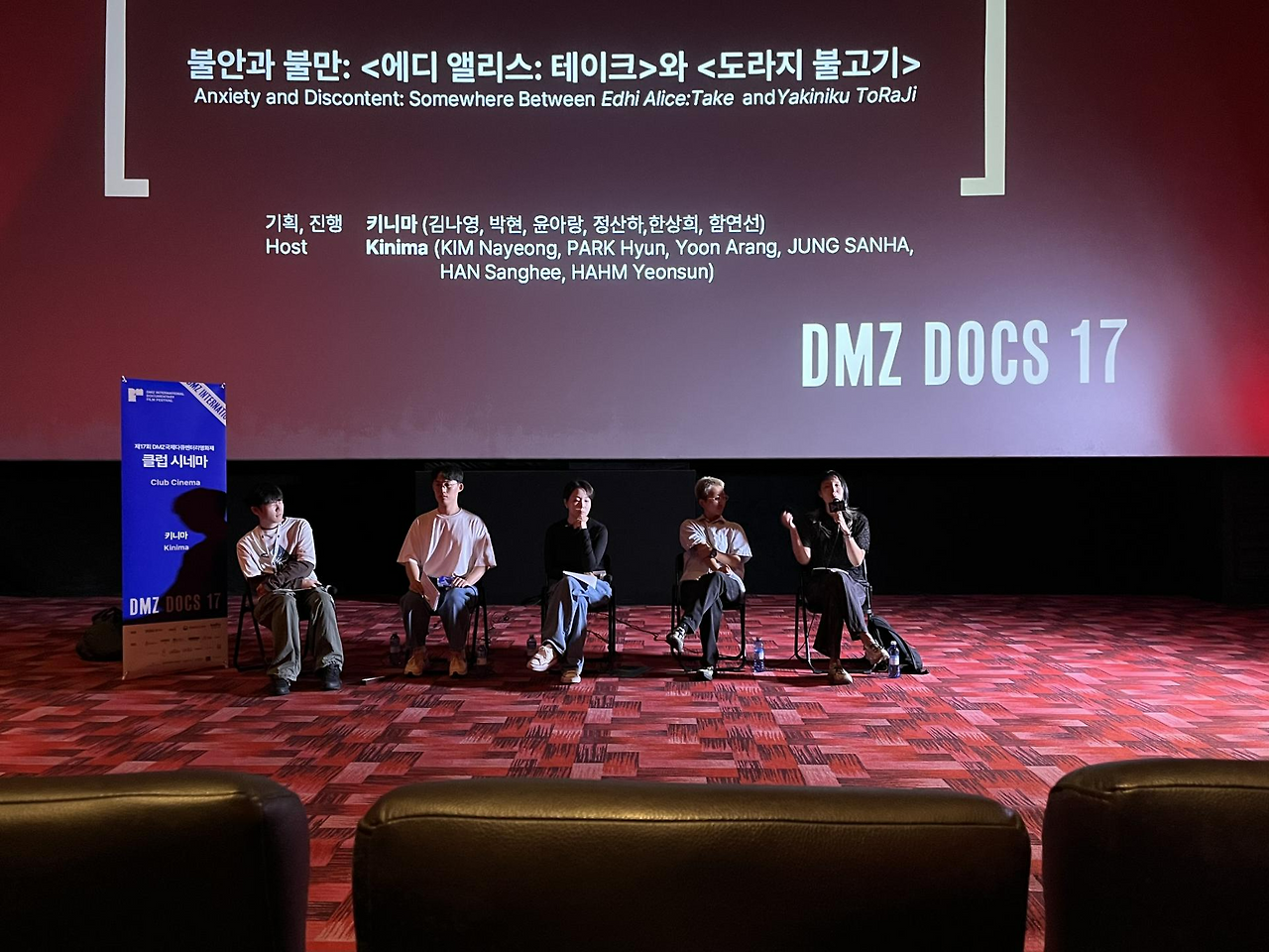 제17회 DMZ국제다큐멘터리에서 새로운 프로그램 이벤트를 런칭했다. 이름은 '클럽 시네마'로, 영화제 측의 설명에 따르면 "자생적인 상영회, 워크숍, 토론회 등을 통해 영화 담론의 결을 풍부히 하는 마이크로 시네마, 커뮤니티 시네마 기획자들이 주도하는, 상영과 담론 생산을 결합한 이벤트"라고 한다. 달리 말해, 올해 상영작들을 기획자들의 관점에 따라 리맵핑할 수 있도록 하는 일종의 외주 행사였던 게다. 그리고 이 포문을 동아시아 다큐멘터리 상영 교류 포럼(Seeds of East Asian Documentary, SEEAD), 소리그림, 그리고 키니마가 따로 또 같이 열게 되었다. 키니마 멤버들이 어떤 태도와 방식으로 동시대 다큐멘터리즘을 대하고 있는 지 잘 보여줄 수 있는 기회라 생각되었고, 이에 맞춰 우리는 (퍽 무리해서...) 두 차례의 라운드테이블을 기획했다. 하나는 한상희 씨가 제안한 「탈각의 몽타주」였고, 다른 하나는 함연선 씨가 제안한 「불안과 불만: <에디 앨리스: 테이크>와 <도라지 불고기>」였다. 김나영, 정산하, 윤아랑, 한상희가 참여한 전자에선 각각 '에세이' 부문과 '익스팬디드' 부문에서 각각 상영된 <안녕, 코키>와 <다리아의 밤 꽃들>을 묶어, "불균질한 형식조차 관습으로 포섭해버린 동시대 다큐멘터리가 추구할 수 있는 (...) 불온한 잠재성과 가능성을 타진해"보는 자리를 마련했다. 또한 정산하, 박현, 윤아랑, 한상희, 함연선이 참여한 후자에선 (제목에도 적혀있듯) '한국경쟁' 부문과 '크리틱스 초이스' 부문에서 각각 상영된 <에디 앨리스: 테이크>와 <도라지 불고기>를 대질하며 "새롭고자 하는 욕망을 공통의 유산으로 끌어안은 채 서로의 반대편에 서 있는 듯 보"이는 "이 둘을 그토록 달라보이게 만드는 건 무엇"인지를 따져보았다. 개인적으론 간략한 소주제들만 정하고 거의 즉흥으로 임했는데도 말이 나쁘지 않게 나와서 뿌듯했고, 정산하 씨의 (유운성 평론가의 말투를 표절한) 진행 실력에 놀랐으며, 키니마가 갖고자 하는 전투적인 태도를 여러 관객들에게 보여드릴 수 있어서 보람찬 자리였다.